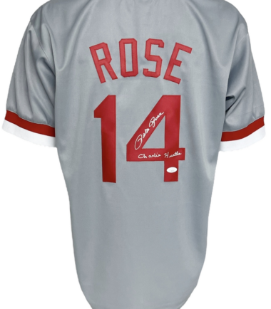 Cincinatti Reds Pete Rose Autographed Pro Style Grey Jersey “Charlie Hustle” JSA Authenticated