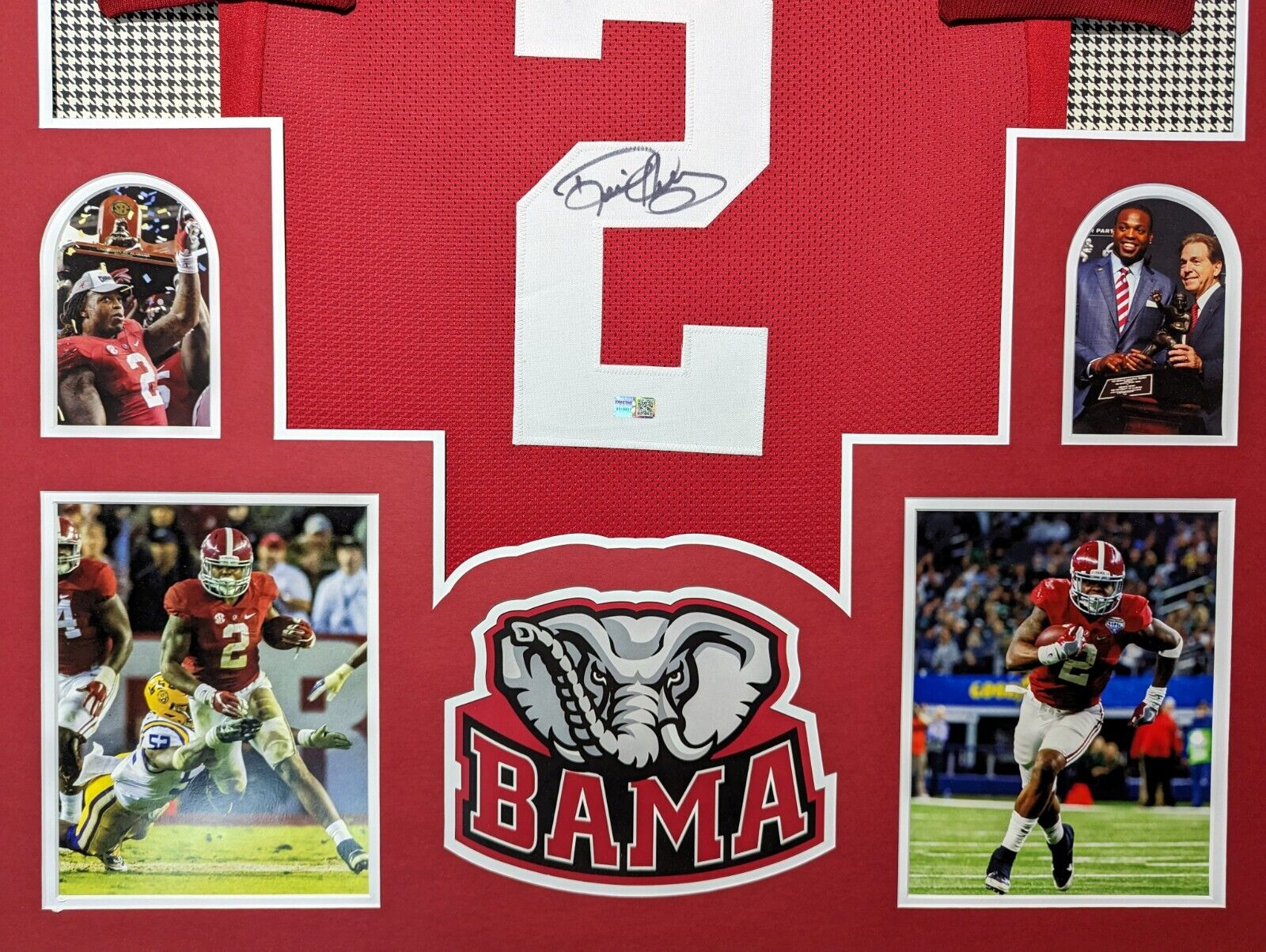 Custom Framed Derrick Henry hand signed Alabama Crimson Tide style custom jersey. Tristar Hologram The authentication is from Tristar. This signature is WITNESSED by a representative of Tristar! 100% AUTHENTIC!!! The jersey has fully stitched numbers on the front and back. It is a great item and a must for all great sports fans! This item is professionally framed, it measures 32”x40” inside , 42”x34” outside , using UV protective Acrylic glass for safe keeping and safe transport, team color matting, black moulding and hanging hooks on the back. All additional items in frame seen in pictures included. 100% ready to hang in your fan cave. Returns accepted if item is not as described or damaged and must be returned within 7 days of delivery to buyer.