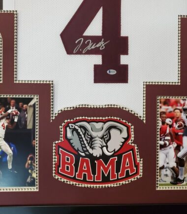 Custom Framed Jerry Jeudy hand Alabama Crimson Tide style custom jersey. Beckett Hologram and COA The authentication is from BAS. This signature is authenticated by a representative of BAS! 100% AUTHENTIC!!! The jersey has fully stitched numbers on the front and back. It is a great item and a must for all great sports fans! This item is professionally framed, it measures 32”x40” inside , 42”x34” outside , using UV protective Acrylic glass for safe keeping and safe transport, team color matting, black moulding and hanging hooks on the back. All additional items in frame seen in pictures included. 100% ready to hang in your fan cave. Returns accepted if item is not as described or damaged and must be returned within 7 days of delivery to buyer.