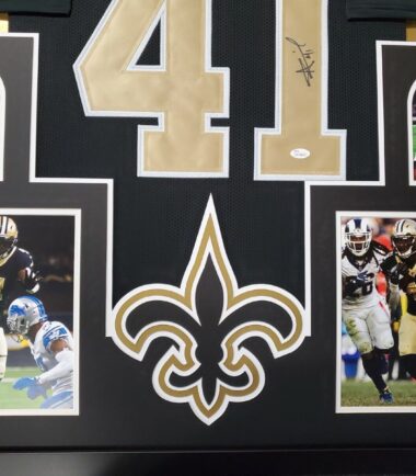 Custom Framed Alvin Kamara hand signed New Orleans Saints jersey.JSA Hologram and COA(#WP798879)The authentication is from JSA. This signature is not authenticated by opinion but it is WITNESSED by a representative of JSA! 100% AUTHENTIC!!! The jersey has fully stitched numbers on the front and back. It is a great item and a must for all great sports fans!This item is professionally framed, it measures 32”x40” inside , 42”x34” outside , using UV protective Acrylic glass for safe keeping and safe transport, team color matting, black moulding and hanging hooks on the back. All additional items in frame seen in pictures included. 100% ready to hang in your fan cave. Shipping and handling is $49.99 to domestic United States using FedEx ground. All international shipping is made through Ebay global shipping. 6% sales tax applies to PA residents. We ship multiple times a week and your item will ship within 3 days of purchase. Local pick up is accepted. Returns accepted if item is not as described or damaged and must be returned within 7 days of delivery to buyer. All payments accepted through Paypal and are expected within 3 days of purchase. I aim to make every transaction smooth and will leave feedback, please do so in return. I will combine shipping where possible, so please wait for invoice on multiple purchases. Any questions please ask!! Thank you for looking!!! If you like the framing, feel free to ask how you can have your personal items framed. We also have wholesale pricing for dealers.