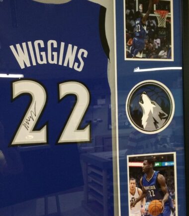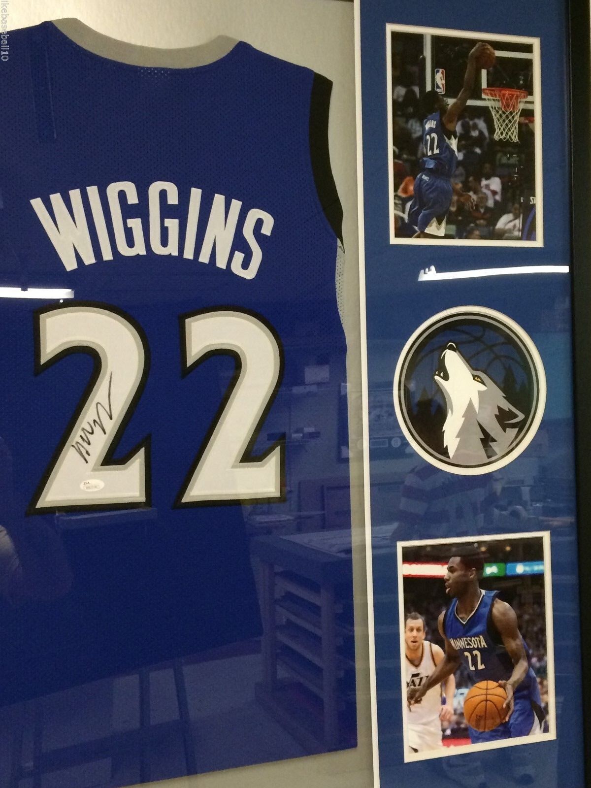 Custom Framed Andrew Wiggins hand signed Minnesota Timberwolves jersey.JSA Hologram and COA(#W823744)The authentication is from JSA. This signature is not authenticated by opinion but it is WITNESSED by a representative of JSA! 100% AUTHENTIC!!! The jersey has fully stitched numbers on the front and back. It is a great item and a must for all great sports fans!This item is professionally framed, it measures 32”x40” inside , 42”x34” outside , using UV protective Acrylic glass for safe keeping and safe transport, team color matting, black moulding and hanging hooks on the back. All additional items in frame seen in pictures included. 100% ready to hang in your fan cave.