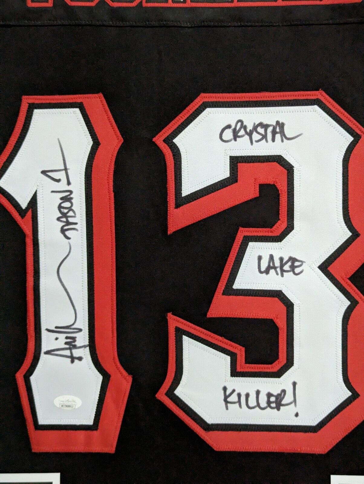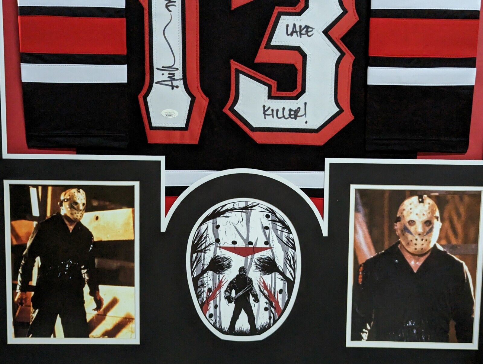 Custom Framed ARI LEHMAN SIGNED INSCRIBED “Jason 1” & “Crystal Lake Killer!” JASON VOORHEES FRIDAY THE 13TH CUSTOM JERSEYJSA Hologram and COAThe authentication is from JSA. This signature is WITNESSED by a representative of JSA! 100% AUTHENTIC!!! The jersey has fully stitched numbers on the front and back. It is a great item and a must for all great sports fans!Stock photos are used for auctions. Will receive equal quality.This item is professionally framed, it measures 32”x40” inside , 42”x34” outside , using UV protective Acrylic glass for safe keeping and safe transport, team color matting, black moulding and hanging hooks on the back. All additional items in frame seen in pictures included. 100% ready to hang. +C30