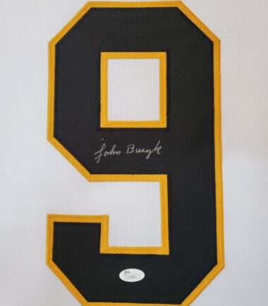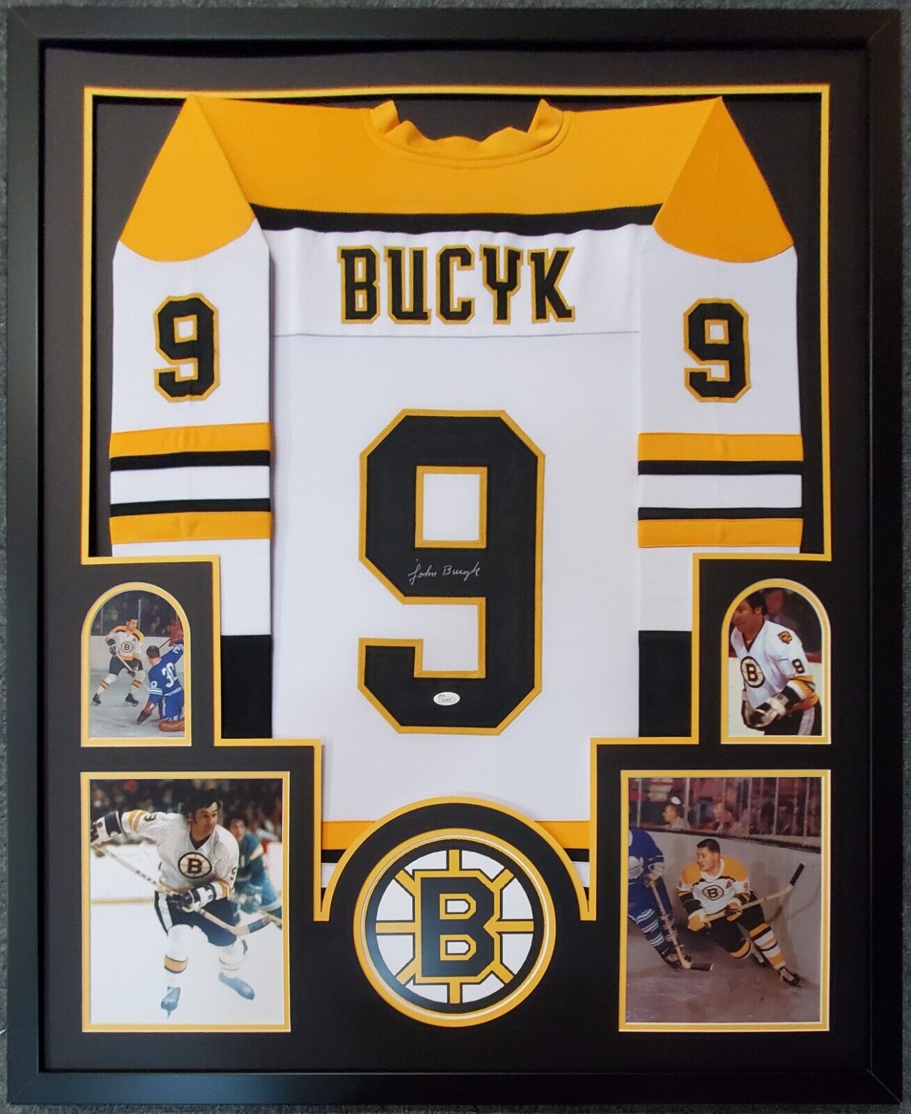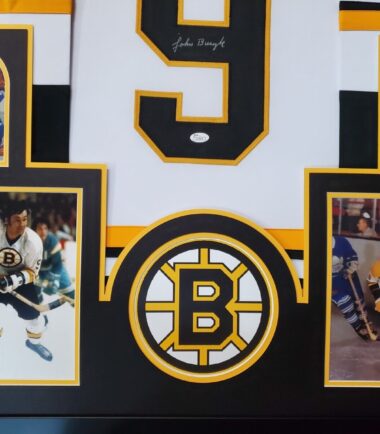 Custom Framed Johnny Bucyk hand signed Boston Bruins style custom jersey. JSA Hologram and COA The authentication is from JSA. 100% AUTHENTIC!!! The jersey has fully stitched numbers on the front and back. It is a great item and a must for all great sports fans! This item is professionally framed, it measures 32”x40” inside , 42”x34” outside , using UV protective Acrylic glass for safe keeping and safe transport, team color matting, black moulding and hanging hooks on the back. All additional items in frame seen in pictures included. 100% ready to hang in your fan cave. Returns accepted if item is not as described or damaged and must be returned within 7 days of delivery to buyer.