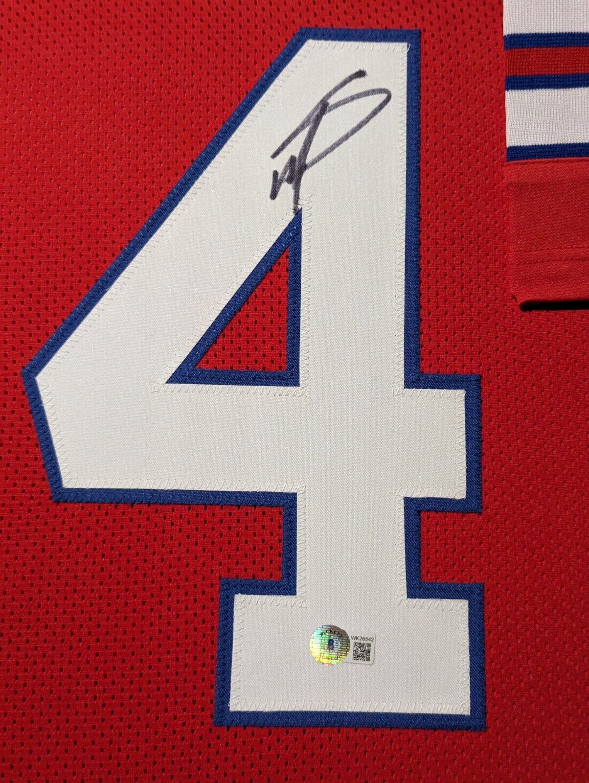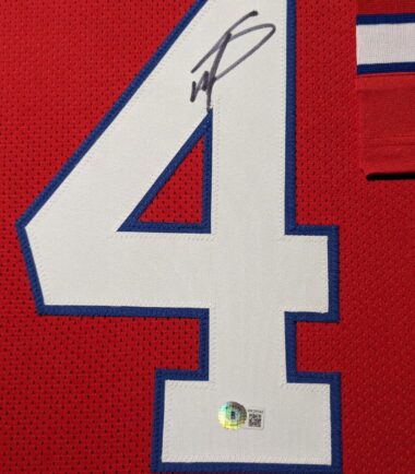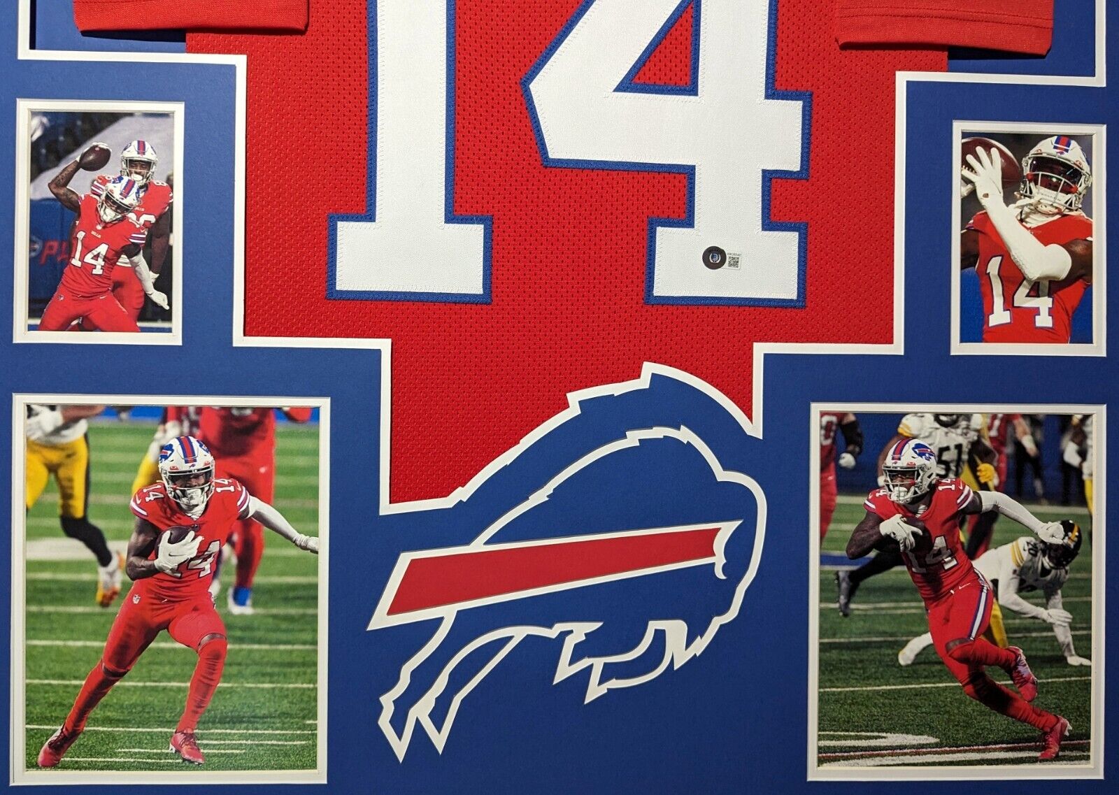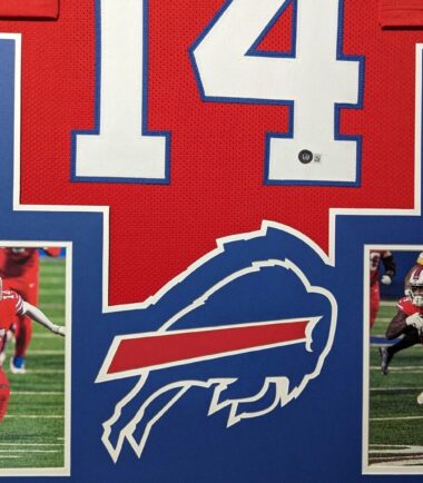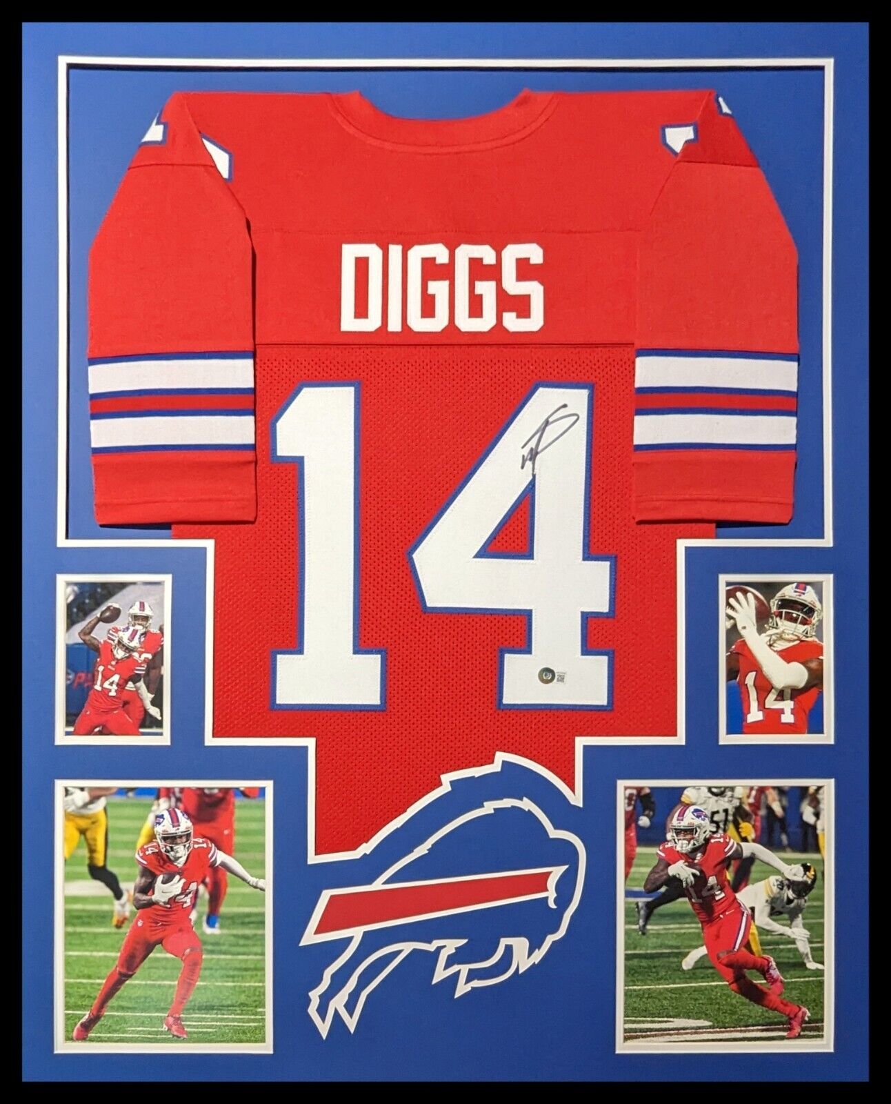 Custom Framed Stefon Diggs hand signed Buffalo Bills style custom jersey.Beckett HologramThe authentication is from Beckett. This signature is WITNESSED by a representative of Beckett! 100% AUTHENTIC!!! The jersey has fully stitched numbers on the front and back. It is a great item and a must for all great sports fans!Stock photos are used for auctions. Will receive equal quality.This item is professionally framed, it measures 32”x40” inside , 42”x34” outside , using UV protective Acrylic glass for safe keeping and safe transport, team color matting, black moulding and hanging hooks on the back. All additional items in frame seen in pictures included. 100% ready to hang in your fan cave.