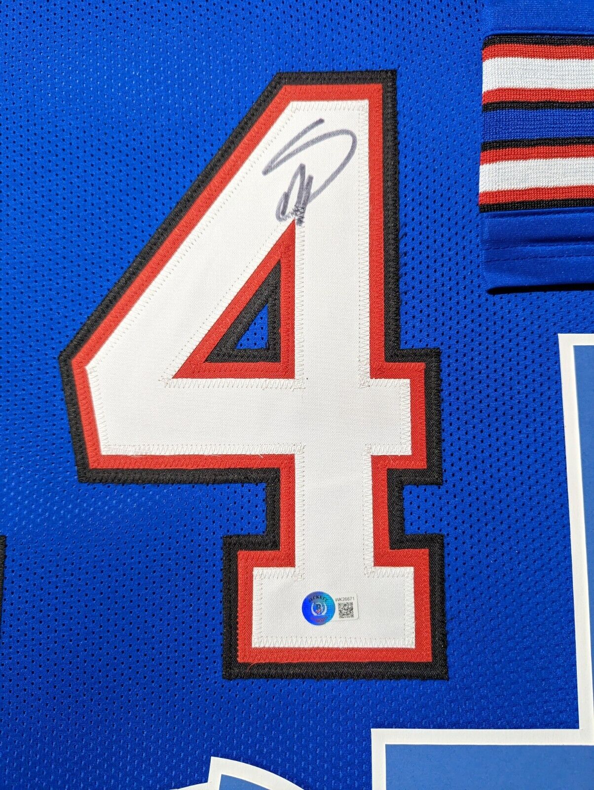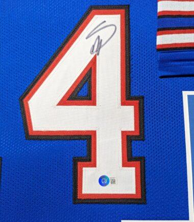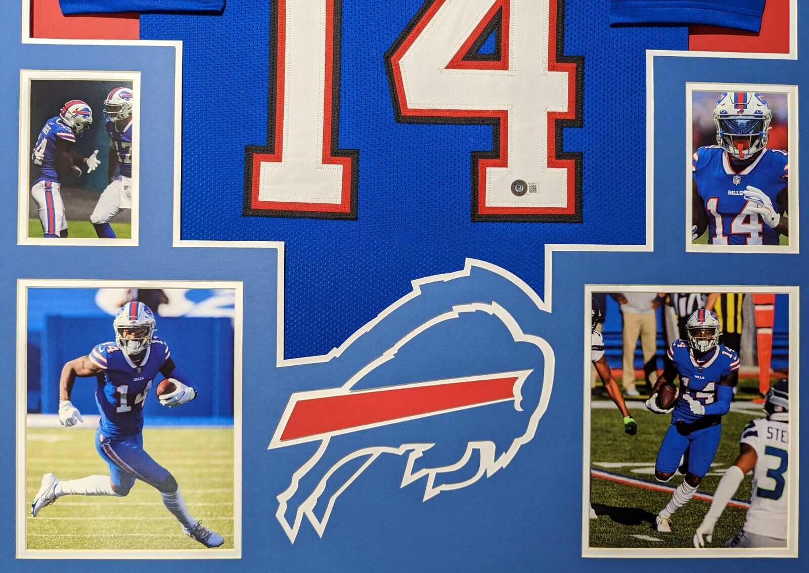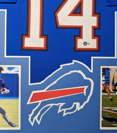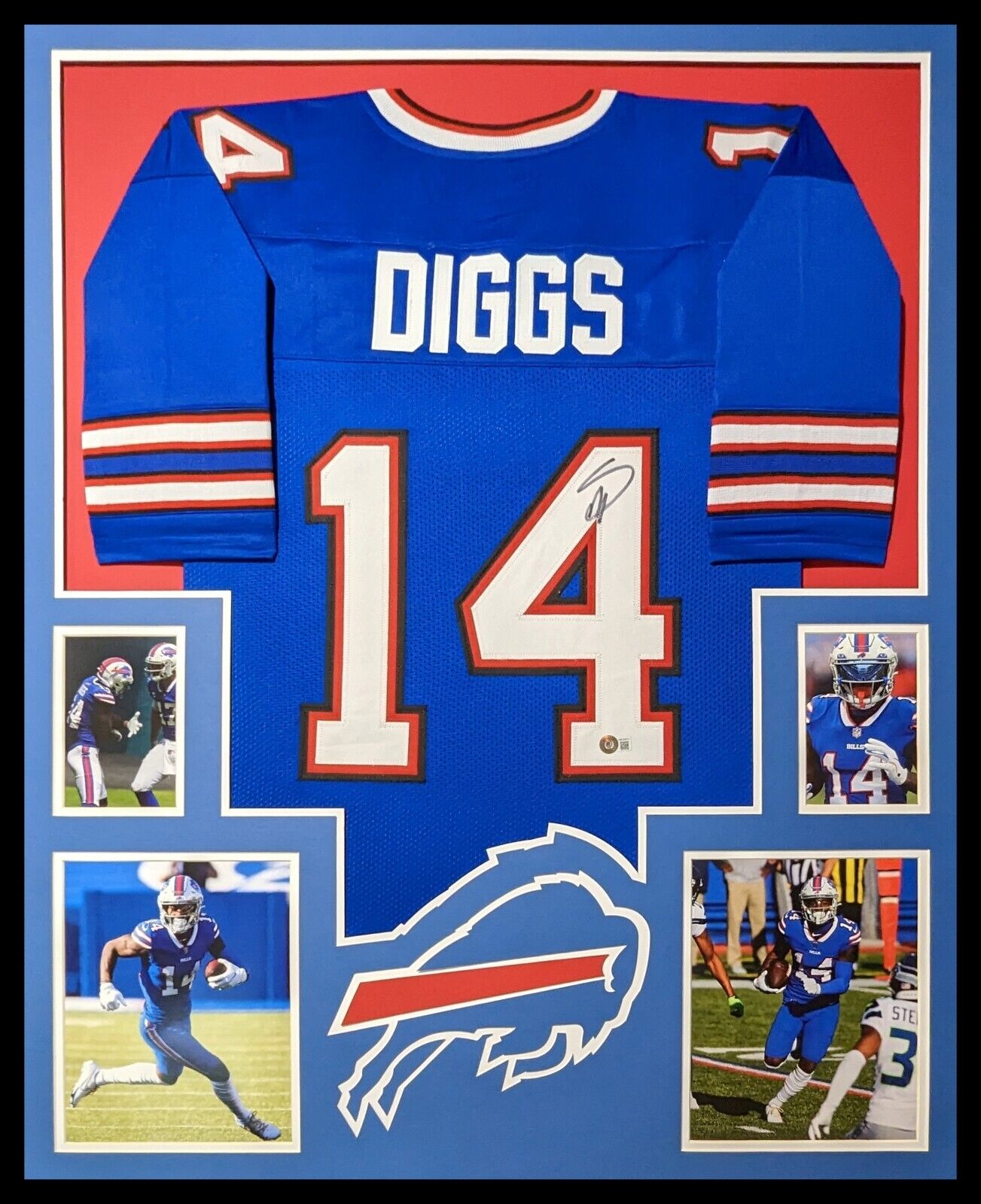 Custom Framed Stefon Diggs hand signed Buffalo Bills style custom jersey.Beckett HologramThe authentication is from Beckett. This signature is WITNESSED by a representative of Beckett! 100% AUTHENTIC!!! The jersey has fully stitched numbers on the front and back.  It is a great item and a must for all great sports fans!This item is professionally framed, it measures 32”x40” inside , 42”x34” outside , using UV protective Acrylic glass for safe keeping and safe transport, team color matting, black moulding and hanging hooks on the back.  All additional items in frame seen in pictures included. 100% ready to hang in your fan cave.