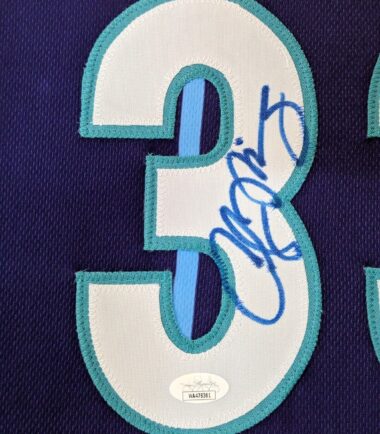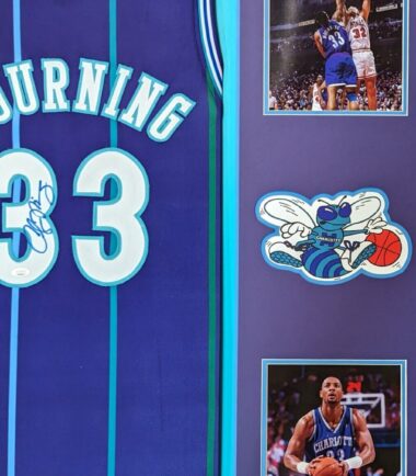 Custom Framed Alonzo Mourning signed Charlotte Hornets style custom jersey.JSA Hologram and COAThe authentication is from JSA. This signature is authenticated by a representative of JSA! 100% AUTHENTIC!!! The jersey has fully stitched numbers on the front and back. It is a great item and a must for all great sports fans!This item is professionally framed, it measures 32”x40” inside , 42”x34” outside , using UV protective Acrylic glass for safe keeping and safe transport, team color matting, black moulding and hanging hooks on the back. All additional items in frame seen in pictures included. 100% ready to hang in your fan cave.