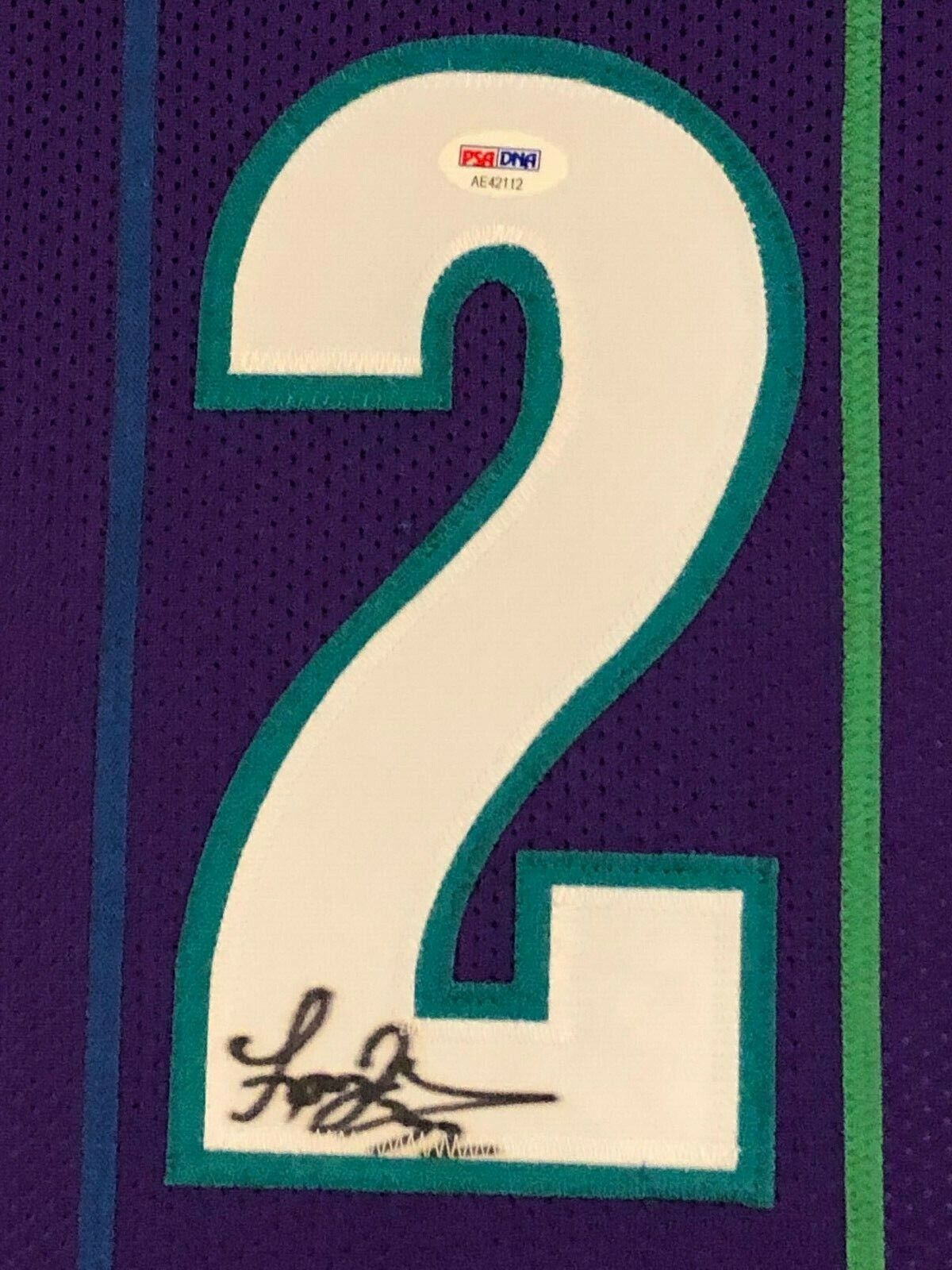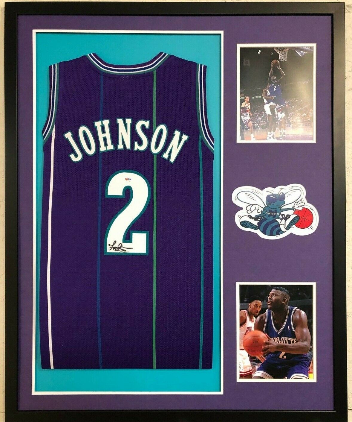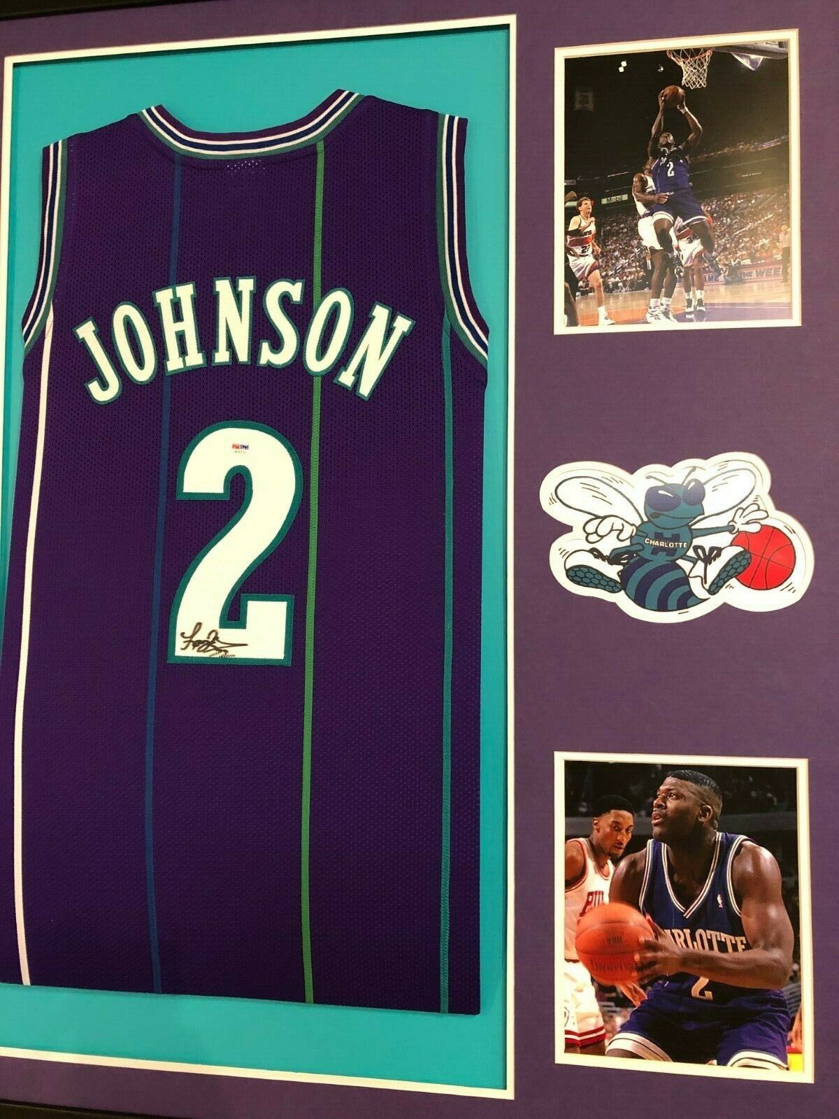 Custom Framed Larry Johnson signed Charlotte Hornets jersey.PSA Hologram and COA(#AE42112)The authentication is from PSA. This signature is authenticated by a representative of PSA! 100% AUTHENTIC!!! The jersey has fully stitched numbers on the front and back. It is a great item and a must for all great sports fans!This item is professionally framed, it measures 32”x40” inside , 42”x34” outside , using UV protective Acrylic glass for safe keeping and safe transport, team color matting, black moulding and hanging hooks on the back. All additional items in frame seen in pictures included. 100% ready to hang in your fan cave.