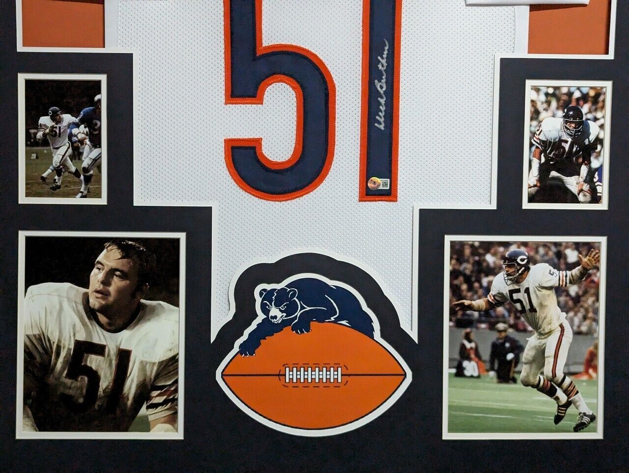 Custom Framed Dick Butkus hand signed Chicago Bears style custom jersey.Beckett HologramThe authentication is from BAS. This signature is WITNESSED by a representative of BAS! 100% AUTHENTIC!!! The jersey has fully stitched numbers on the front and back. It is a great item and a must for all great sports fans!Stock photos are used for auctions. Will receive equal qualityThis item is professionally framed, it measures 32”x40” inside , 42”x34” outside , using UV protective Acrylic glass for safe keeping and safe transport, team color matting, black moulding and hanging hooks on the back. All additional items in frame seen in pictures included. 100% ready to hang in your fan cave. Shipping and handling is $49.99 to domestic United States using FedEx ground. All international shipping is made through Ebay global shipping. 6% sales tax applies to PA residents. We ship multiple times a week and your item will ship within 3 days of purchase. Local pick up is accepted. Returns accepted if item is not as described or damaged and must be returned within 7 days of delivery to buyer. All payments accepted through Paypal and are expected within 3 days of purchase. I aim to make every transaction smooth and will leave feedback, please do so in return. I will combine shipping where possible, so please wait for invoice on multiple purchases. Any questions please ask!! Thank you for looking!!! If you like the framing, feel free to ask how you can have your personal items framed. We also have wholesale pricing for dealers.