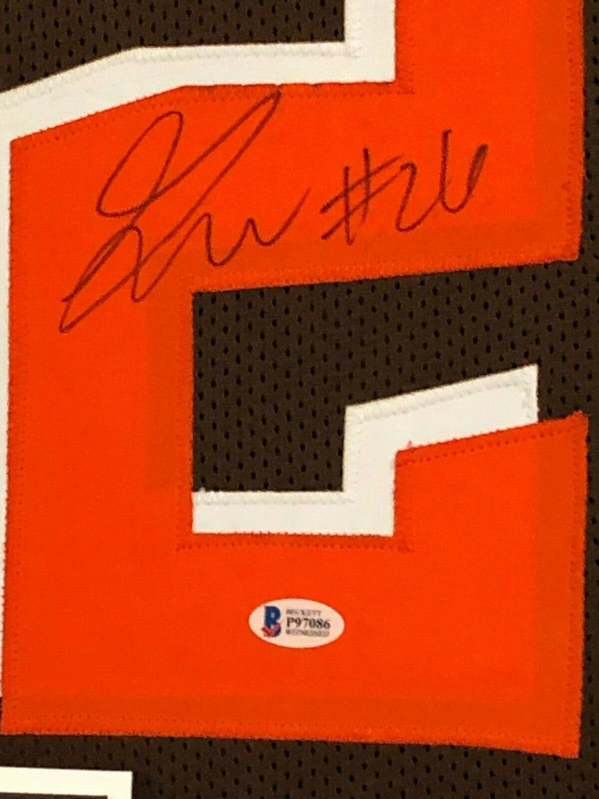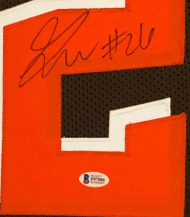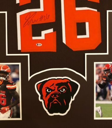 Custom Framed Greedy Williams hand signed Cleveland Browns custom jersey.Beckett HOLO and COA(#P97086)The authentication is from BAS. This signature is not authenticated by opinion but it is WITNESSED by a representative of BAS! 100% AUTHENTIC!!!   The jersey has fully stitched numbers on the front and back.  It is a great item and a must for all great sports fans!Stock photos are used for auctions. Will receive equal quality.This item is professionally framed, it measures 32”x40” inside , 42”x34” outside , using UV protective Acrylic glass for safe keeping and safe transport, team color matting, black moulding and hanging hooks on the back.  All additional items in frame seen in pictures included. 100% ready to hang in your fan cave.