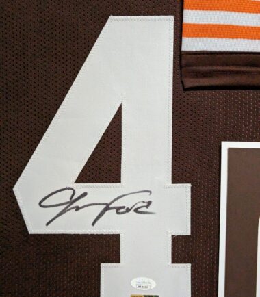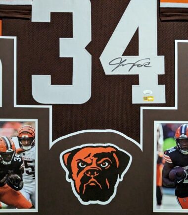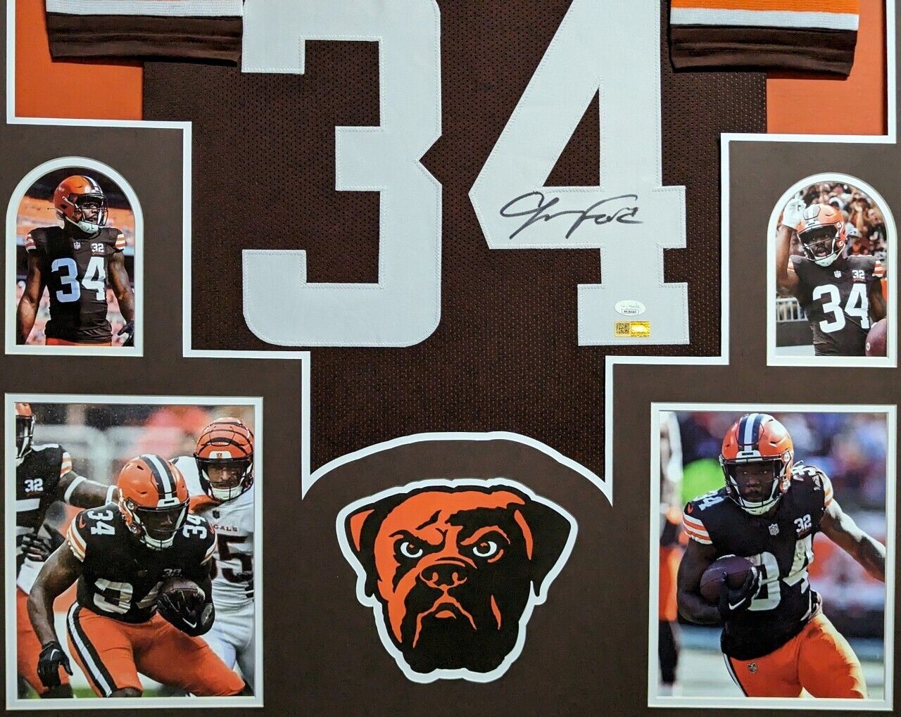 Custom Framed Jerome Ford hand signed Cleveland Browns style custom jersey.JSA Hologram and COAThe authentication is from JSA. This signature is WITNESSED by a representative of JSA! 100% AUTHENTIC!!!   The jersey has fully stitched numbers on the front and back.  It is a great item and a must for all great sports fans.This item is professionally framed, it measures 32”x40” inside , 42”x34” outside , using UV protective Acrylic glass for safe keeping and safe transport, team color matting, black moulding and hanging hooks on the back.  All additional items in frame seen in pictures included. 100% ready to hang in your fan cave.   Shipping and handling is $49.99 to domestic United States using FedEx ground. All international shipping is made through Ebay global shipping.  6% sales tax applies to PA residents. We ship multiple times a week and your item will ship within 3 days of purchase. Local pick up is accepted. Returns accepted if item is not as described or damaged and must be returned within 7 days of delivery to buyer. All payments accepted through Paypal and are expected within 3 days of purchase. I aim to make every transaction smooth and will leave feedback, please do so in return. I will combine shipping where possible, so please wait for invoice on multiple purchases. Any questions please ask!! Thank you for looking!!!  If you like the framing, feel free to ask how you can have your personal items framed. We also have wholesale pricing for dealers.