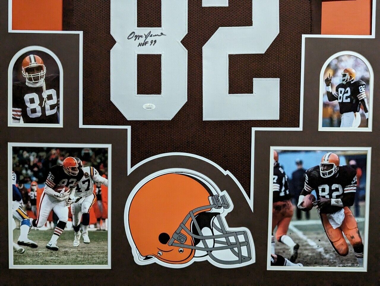 Custom Framed Ozzie Newsome hand signed Cleveland Browns style custom jersey.”HOF 99″ InscribedJSA Hologram and COAThe authentication is from JSA. This signature is WITNESSED by a representative of JSA! 100% AUTHENTIC!!! The jersey has fully stitched numbers on the front and back. It is a great item and a must for all great sports fans.This item is professionally framed, it measures 32”x40” inside , 42”x34” outside , using UV protective Acrylic glass for safe keeping and safe transport, team color matting, black moulding and hanging hooks on the back. All additional items in frame seen in pictures included. 100% ready to hang in your fan cave. Shipping and handling is $49.99 to domestic United States using FedEx ground. All international shipping is made through Ebay global shipping. 6% sales tax applies to PA residents. We ship multiple times a week and your item will ship within 3 days of purchase. Local pick up is accepted. Returns accepted if item is not as described or damaged and must be returned within 7 days of delivery to buyer. All payments accepted through Paypal and are expected within 3 days of purchase. I aim to make every transaction smooth and will leave feedback, please do so in return. I will combine shipping where possible, so please wait for invoice on multiple purchases. Any questions please ask!! Thank you for looking!!! If you like the framing, feel free to ask how you can have your personal items framed. We also have wholesale pricing for dealers.