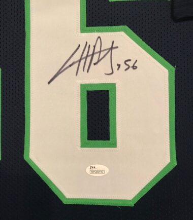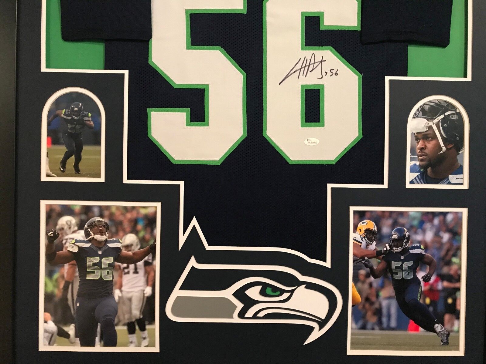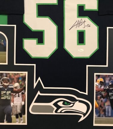 Custom Framed Cliff Avril hand signed Seattle Seahawks custom jersey.JSA Hologram and COA(#WP281440) The authentication is from JSA. This signature is not authenticated by opinion but it is WITNESSED by a representative of JSA! 100% AUTHENTIC!!! The jersey has fully stitched numbers on the front and back. It is a great item and a must for all great sports fans!Stock photos are used for auctions. Will receive equal quality.This item is professionally framed, it measures 32”x40” inside , 42”x34” outside , using UV protective Acrylic glass for safe keeping and safe transport, team color matting, black moulding and hanging hooks on the back. All additional items in frame seen in pictures included. 100% ready to hang in your fan cave.