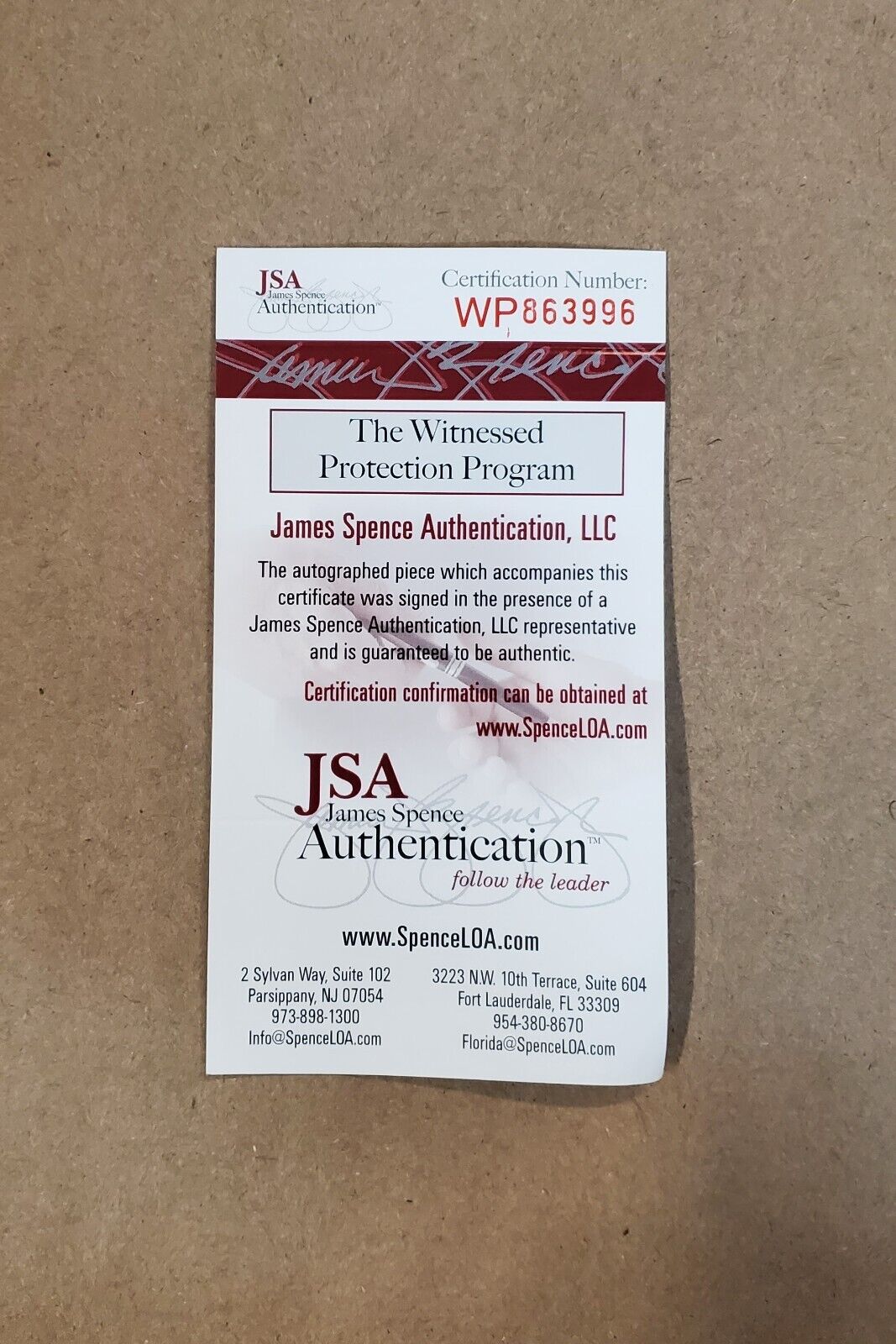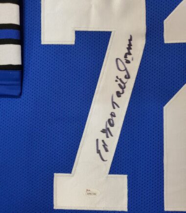 Framed Ed “Too Tall” Jones signed Dallas Cowboys style Custom Jersey. JSA Hologram and COA The authentication is from JSA. This signature is authenticated by a representative of JSA! 100% AUTHENTIC!!! The jersey has fully stitched numbers on the front and back. No tags or logos. This is not an official NFL jersey but it is very high quality. It is a great item and a must for all great sports fans! This item is professionally framed, it measures 32”x40” inside , 42”x34” outside , using UV protective Acrylic glass for safe keeping and safe transport, team color matting, black moulding and hanging hooks on the back. All additional items in frame seen in pictures included. 100% ready to hang in your fan cave.