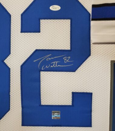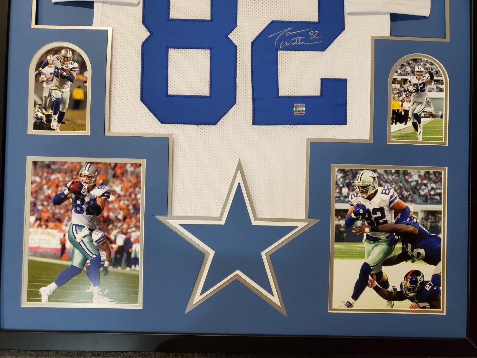 Framed Jason Witten signed Dallas Cowboys style Custom Jersey. JSA Hologram and COA The authentication is from JSA. This signature is authenticated by a representative of JSA! 100% AUTHENTIC!!! The jersey has fully stitched numbers on the front and back. No tags or logos. This is not an official NFL jersey but it is very high quality. It is a great item and a must for all great sports fans! This item is professionally framed, it measures 32”x40” inside , 42”x34” outside , using UV protective Acrylic glass for safe keeping and safe transport, team color matting, black moulding and hanging hooks on the back. All additional items in frame seen in pictures included. 100% ready to hang in your fan cave.