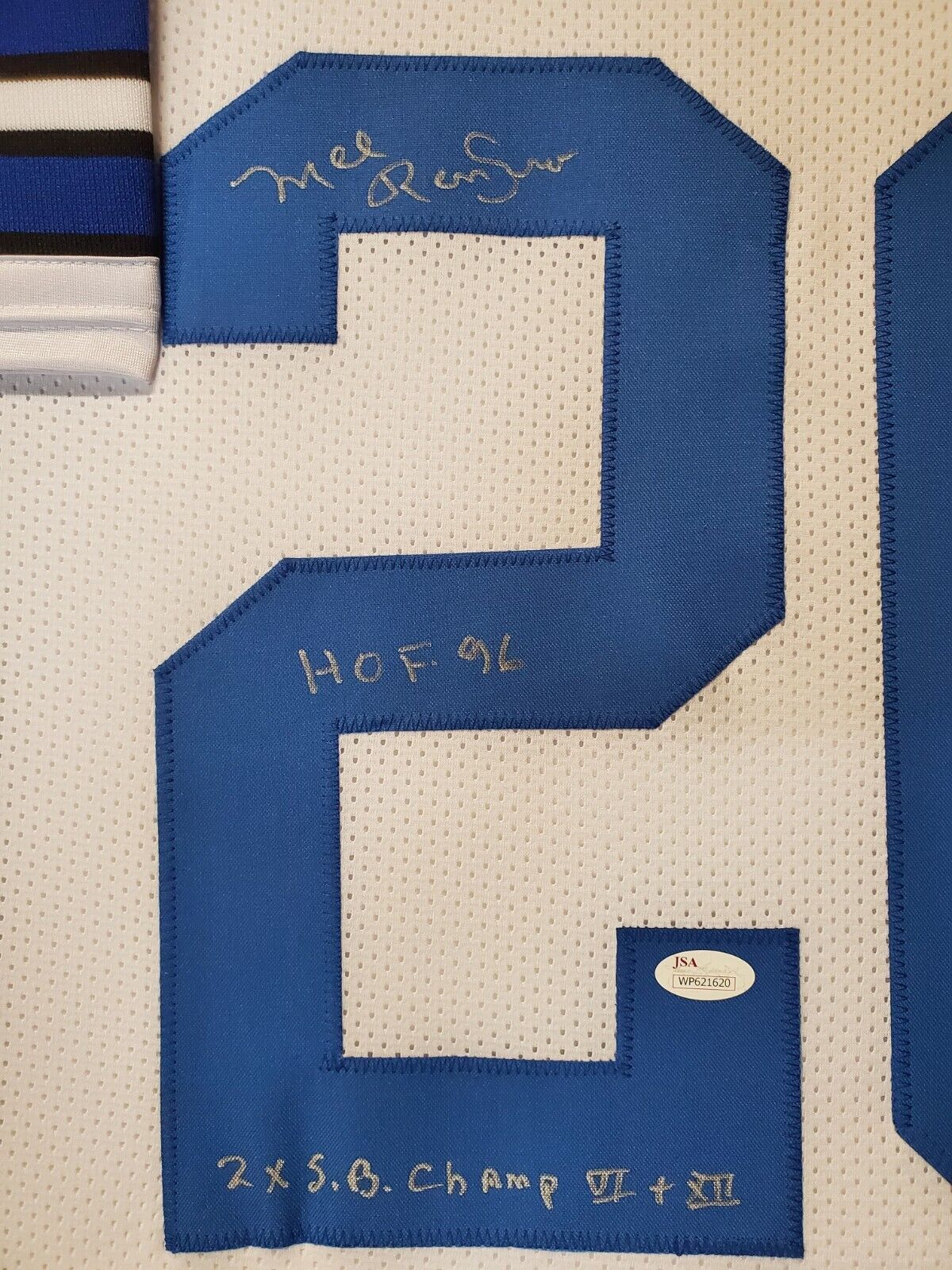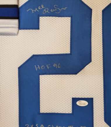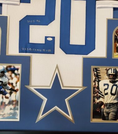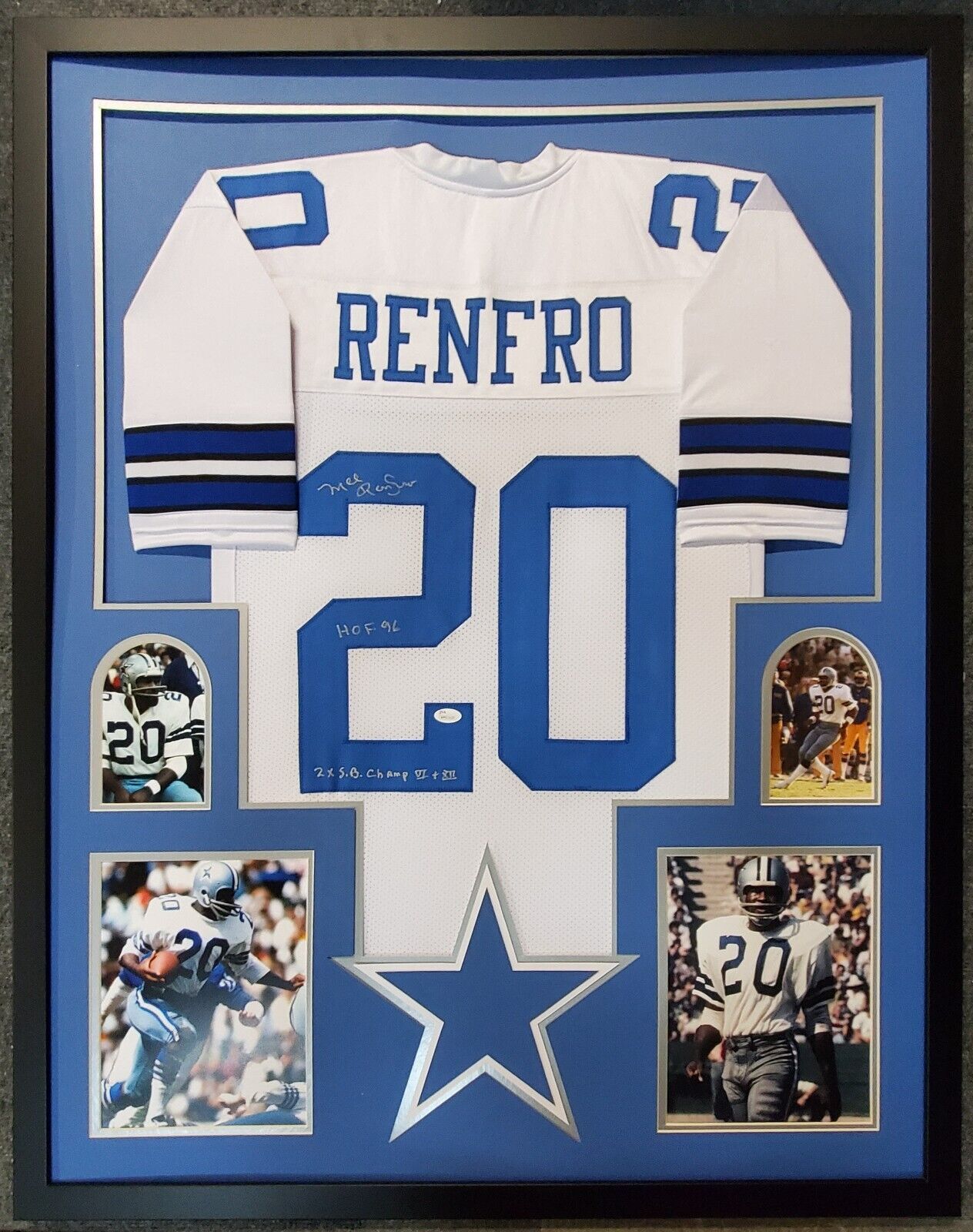 Framed Mel Renfro signed Dallas Cowboys style Custom Jersey”HOF 96″ & “2x S.B. Champ VI + XII” Double Inscribed JSA Hologram and COA (#WP621620) The authentication is from JSA. This signature is authenticated by a representative of JSA! 100% AUTHENTIC!!! The jersey has fully stitched numbers on the front and back. No tags or logos. This is not an official NFL jersey but it is very high quality. It is a great item and a must for all great sports fans! This item is professionally framed, it measures 32”x40” inside , 42”x34” outside , using UV protective Acrylic glass for safe keeping and safe transport, team color matting, black moulding and hanging hooks on the back. All additional items in frame seen in pictures included. 100% ready to hang in your fan cave.
