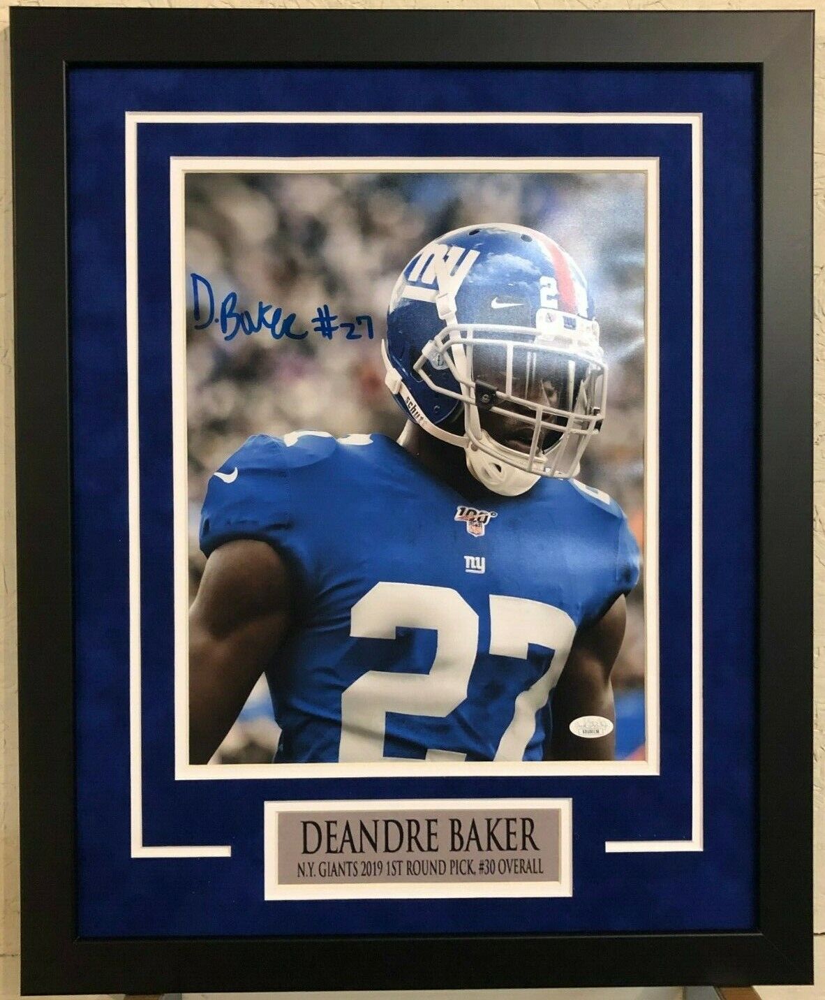 Custom Framed Deandre Baker hand signed 11×14.JSA HOLOGRAM and COA(#SD100158) The authentication is from JSA. This signature is authenticated by a representative of JSA! 100% AUTHENTIC!!! It is a great item and a must for all great sports fans!This item is professionally framed, using team color SUEDE matting, black moulding and hanging hooks on the back. All additional items in frame seen in pictures included. 100% ready to hang in your fan cave.