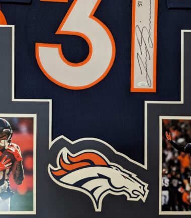 Framed Justin Simmons signed Denver Broncos style Custom Jersey. JSA COA The authentication is from JSA. This signature is authenticated by a representative of JSA! 100% AUTHENTIC!!!   The jersey has fully stitched numbers on the front and back. No tags or logos. This is not an official NFL jersey but it is very high quality. It is a great item and a must for all great sports fans! This item is professionally framed, it measures 32”x40” inside , 42”x34” outside , using UV protective Acrylic glass for safe keeping and safe transport, team color matting, black moulding and hanging hooks on the back.  All additional items in frame seen in pictures included. 100% ready to hang in your fan cave.