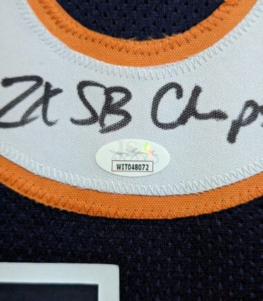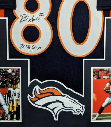 Framed Rod Smith hand signed Denver Broncos style Custom Jersey.”2X SB Champs” Inscribed JSA COA The authentication is from JSA. This signature is authenticated by a representative of JSA! 100% AUTHENTIC!!! The jersey has fully stitched numbers on the front and back. No tags or logos. This is not an official NFL jersey but it is very high quality. It is a great item and a must for all great sports fans! This item is professionally framed, it measures 32”x40” inside , 42”x34” outside , using UV protective Acrylic glass for safe keeping and safe transport, team color matting, black moulding and hanging hooks on the back. All additional items in frame seen in pictures included. 100% ready to hang in your fan cave.