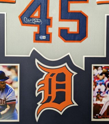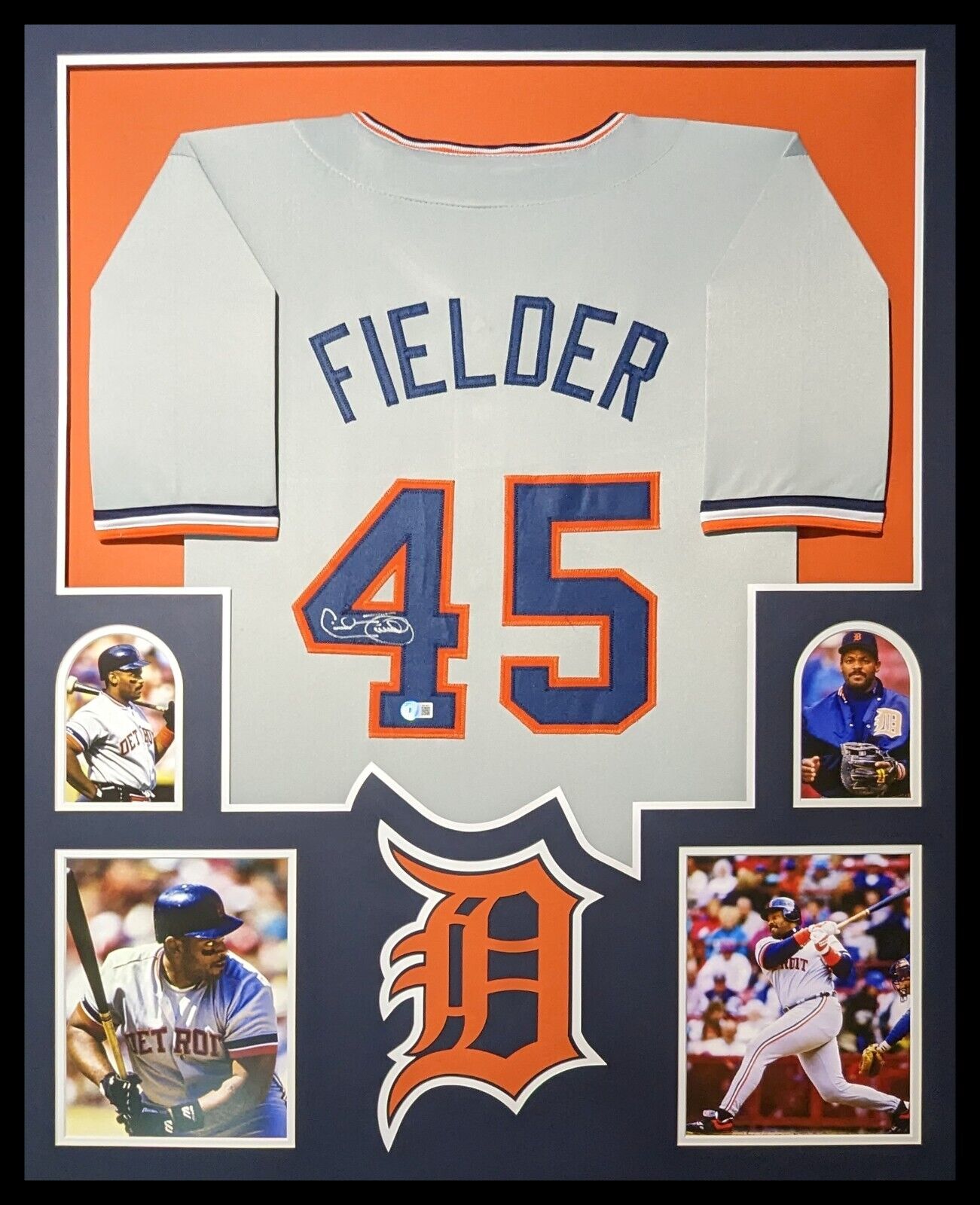 Custom Framed Cecil Fielder hand signed Detroit Tigers style custom jersey.Beckett HoloThe authentication is from Beckett. This signature is WITNESSED by a representative of Beckett! 100% AUTHENTIC!!! The jersey has fully stitched numbers on the front and back. It is a great item and a must for all great sports fans!This item is professionally framed, it measures 32”x40” inside , 42”x34” outside , using UV protective Acrylic glass for safe keeping and safe transport, team color matting, black moulding and hanging hooks on the back. All additional items in frame seen in pictures included. 100% ready to hang in your fan cave.