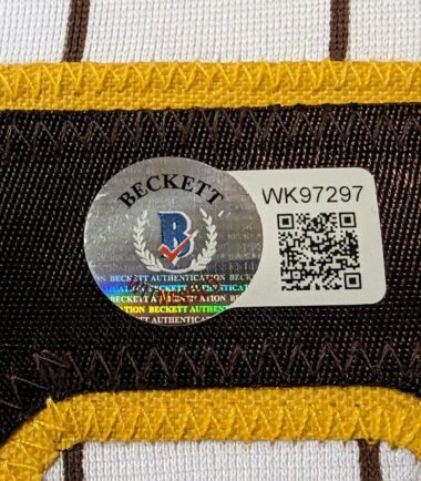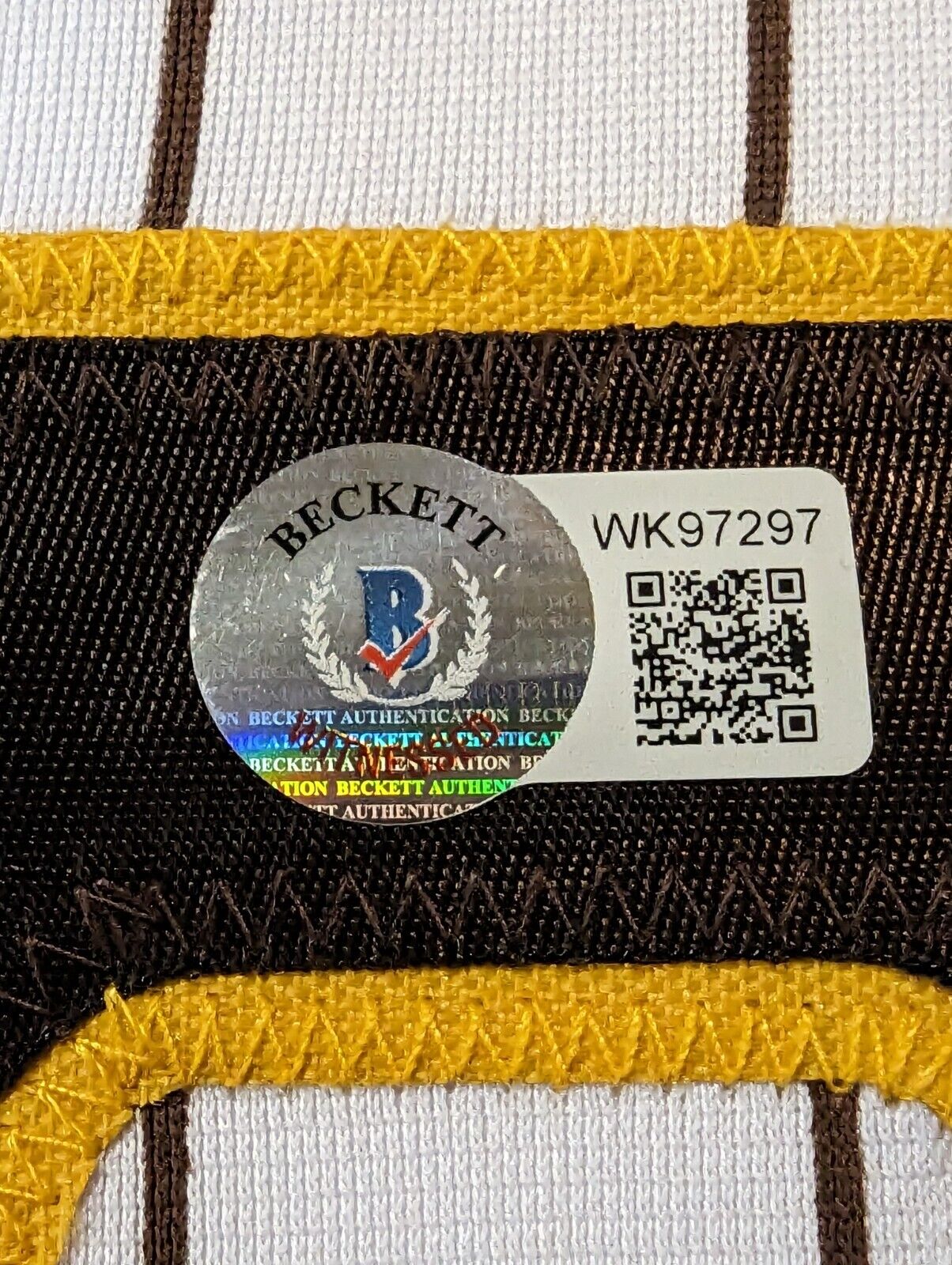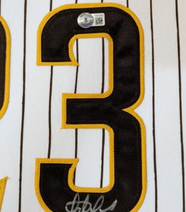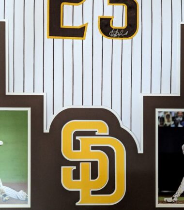 Custom Framed Fernando Tatis Jr hand signed San Diego Padres style custom jersey.Beckett HologramThe authentication is from Beckett. This signature is not authenticated by opinion but it is WITNESSED by a representative of Beckett! 100% AUTHENTIC!!! The jersey has fully stitched numbers on the front and back. It is a great item and a must for all great sports fans!This item is professionally framed, it measures 32”x40” inside , 42”x34” outside , using UV protective Acrylic glass for safe keeping and safe transport, team color matting, black moulding and hanging hooks on the back. All additional items in frame seen in pictures included. 100% ready to hang in your fan cave.