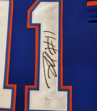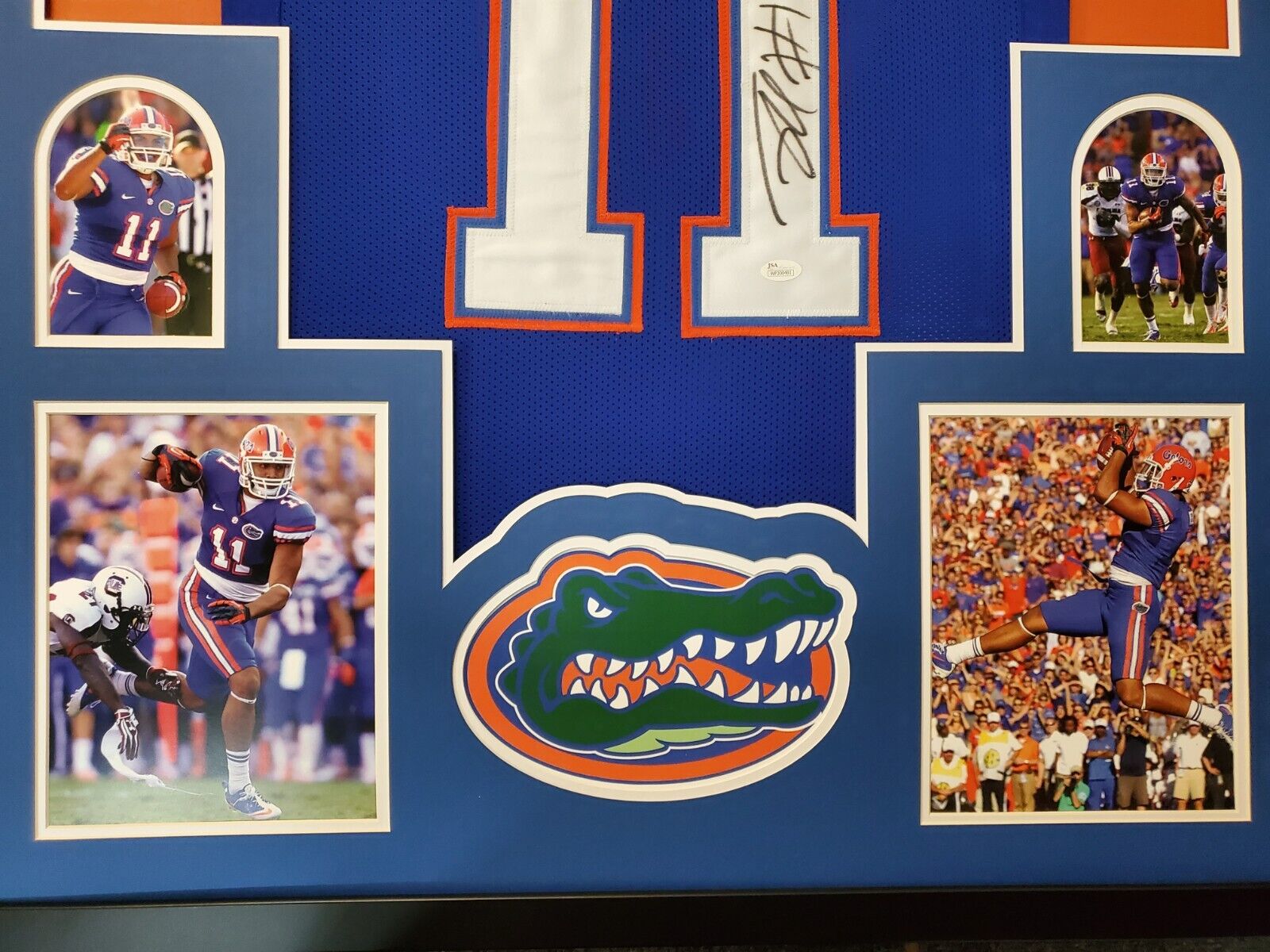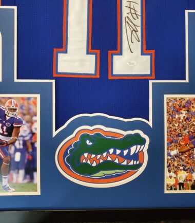 Custom Framed Jordan Reed hand signed Florida Gators style custom jersey. JSA Hologram and COA The authentication is from JSA. 100% AUTHENTIC!!!   The jersey has fully stitched numbers on the front and back.  It is a great item and a must for all great sports fans! This item is professionally framed, it measures 32”x40” inside , 42”x34” outside , using UV protective Acrylic glass for safe keeping and safe transport, team color matting, black moulding and hanging hooks on the back.  All additional items in frame seen in pictures included. 100% ready to hang in your fan cave.    Returns accepted if item is not as described or damaged and must be returned within 7 days of delivery to buyer.