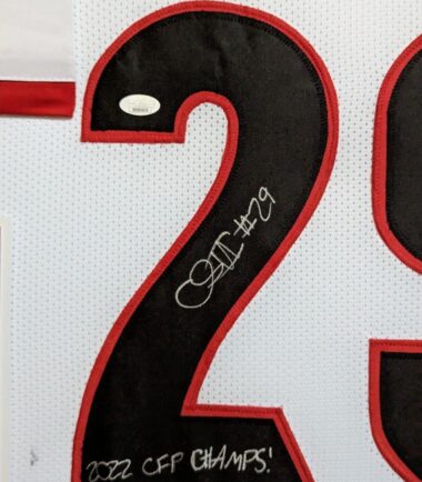 Framed Chris Smith hand signed Georgia Bulldogs style custom jersey.”2022 CFP CHAMPS!” JSA Hologram and COA The authentication is from JSA. This signature is WITNESSED by a representative of JSA! 100% AUTHENTIC!!! The jersey has fully stitched numbers on the front and back. No tags or logos. This is not an official NCAA jersey but it is very high quality. It is a great item and a must for all great sports fans! This item is professionally framed, it measures 32”x40” inside , 42”x34” outside , using UV protective Acrylic glass for safe keeping and safe transport, team color matting, black moulding and hanging hooks on the back. All additional items in frame seen in pictures included. 100% ready to hang in your fan cave. Returns accepted if item is not as described or damaged and must be returned within 7 days of delivery to buyer.