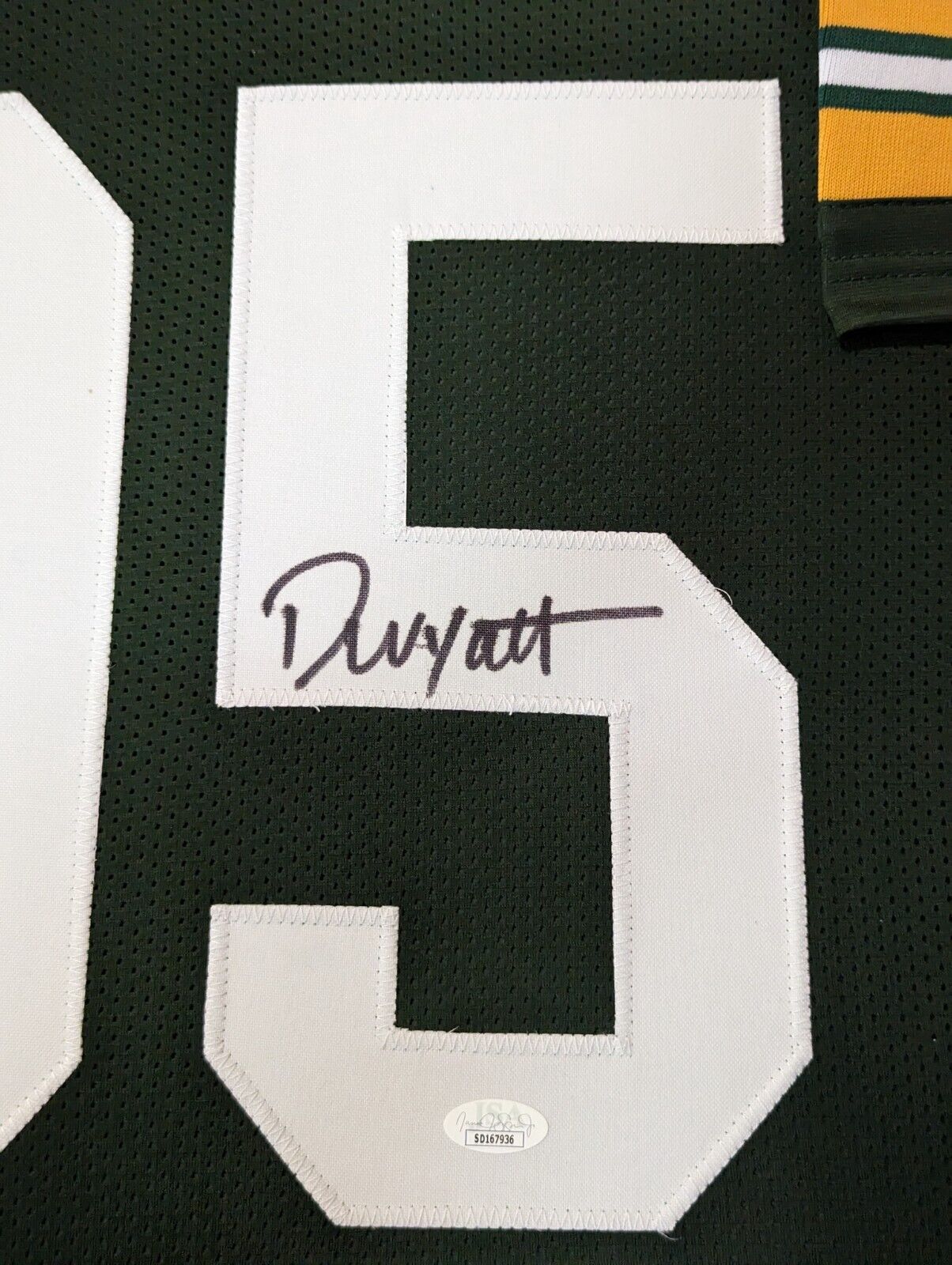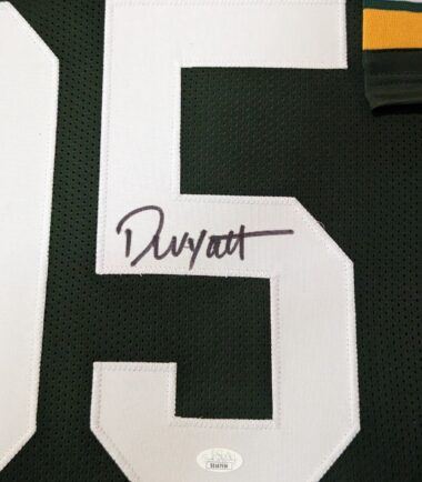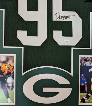 Framed Devonte Wyatt signed Green Bay Packers style Custom Jersey. JSA Hologram and COA The authentication is from JSA. This signature is WITNESSED by a representative of JSA! 100% AUTHENTIC!!! The jersey has fully stitched numbers on the front and back. No tags or logos. This is not an official NFL jersey but it is very high quality. It is a great item and a must for all great sports fans! This item is professionally framed, it measures 32”x40” inside , 42”x34” outside , using UV protective Acrylic glass for safe keeping and safe transport, team color matting, black moulding and hanging hooks on the back. All additional items in frame seen in pictures included. 100% ready to hang in your fan cave.
