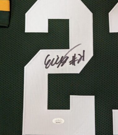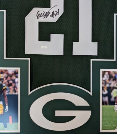Framed Eric Stokes signed Green Bay Packers style custom Jersey. JSA Hologram and COA The authentication is from JSA. This signature is WITNESSED by a representative of JSA! 100% AUTHENTIC!!! The jersey has fully stitched numbers on the front and back. No tags or logos. This is not an official NFL jersey but it is very high quality. It is a great item and a must for all great sports fans! This item is professionally framed, it measures 32”x40” inside , 42”x34” outside , using UV protective Acrylic glass for safe keeping and safe transport, team color matting, black moulding and hanging hooks on the back. All additional items in frame seen in pictures included. 100% ready to hang in your fan cave.