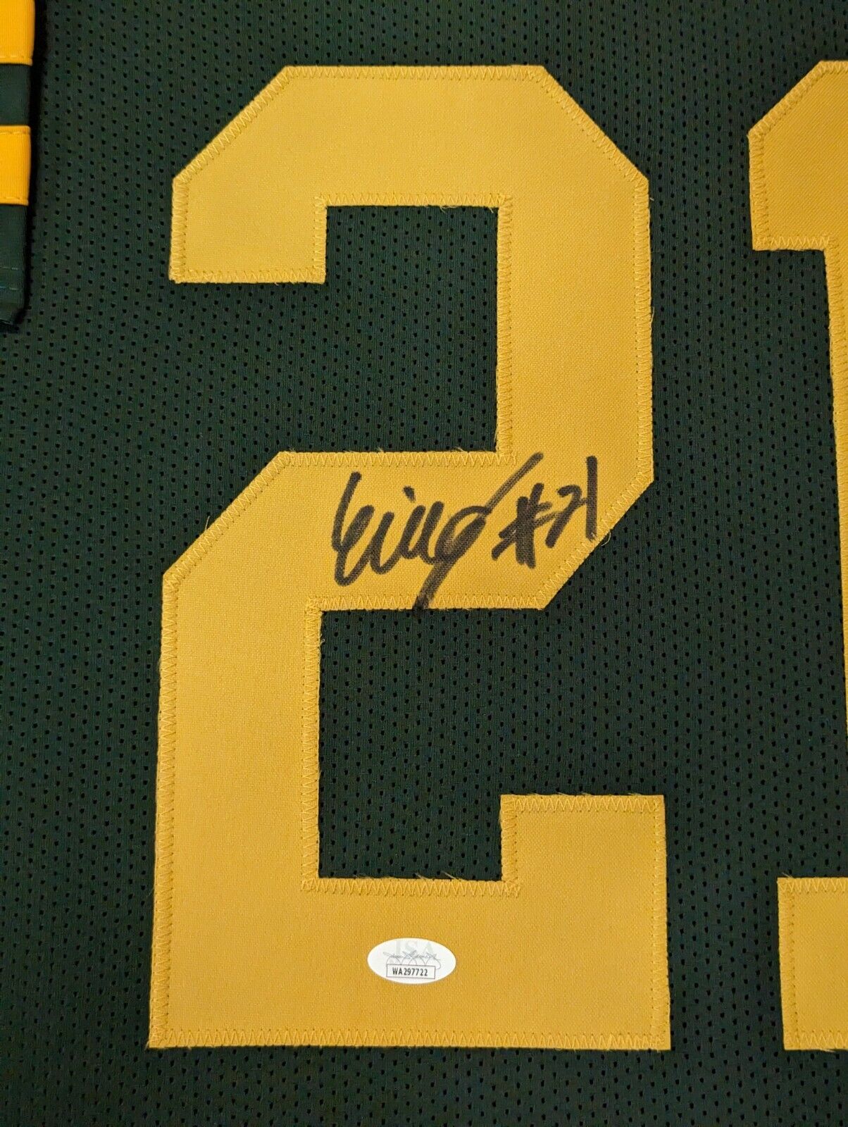 Framed Eric Stokes signed Green Bay Packers style custom Jersey. JSA Hologram and COA The authentication is from JSA. This signature is WITNESSED by a representative of JSA! 100% AUTHENTIC!!! The jersey has fully stitched numbers on the front and back. No tags or logos. This is not an official NFL jersey but it is very high quality. It is a great item and a must for all great sports fans! This item is professionally framed, it measures 32”x40” inside , 42”x34” outside , using UV protective Acrylic glass for safe keeping and safe transport, team color matting, black moulding and hanging hooks on the back. All additional items in frame seen in pictures included. 100% ready to hang in your fan cave.