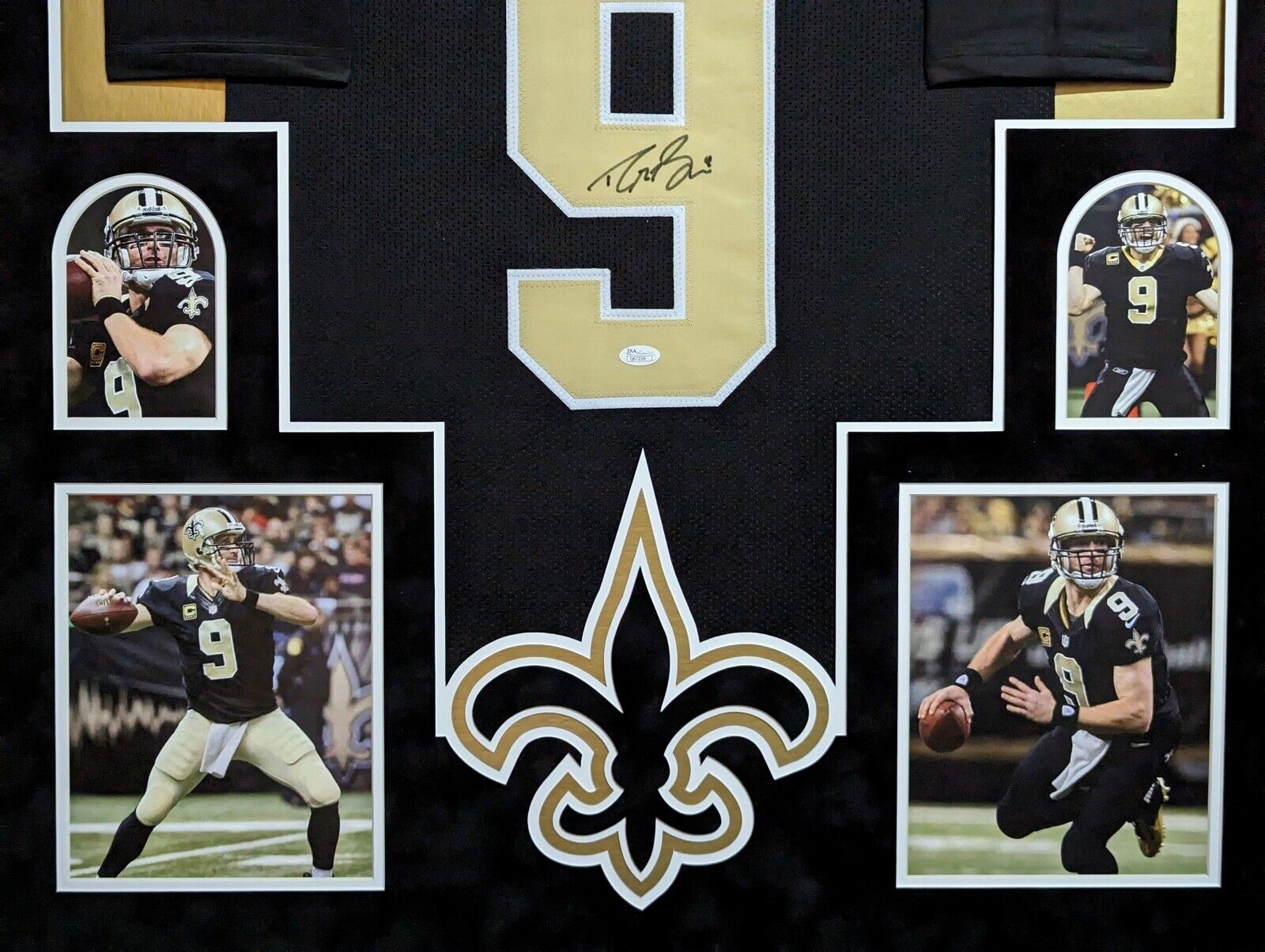 Custom Framed Drew Brees hand signed New Orleans Saints style custom jersey.JSA Hologram and COAThe authentication is from JSA. This signature is WITNESSED by a representative of JSA! 100% AUTHENTIC!!!   The jersey has fully stitched numbers on the front and back.  It is a great item and a must for all great sports fans!This item is professionally framed, it measures 32”x40” inside , 42”x34” outside , using UV protective Acrylic glass for safe keeping and safe transport, SUEDE team color matting, black moulding and hanging hooks on the back.  All additional items in frame seen in pictures included. 100% ready to hang in your fan cave.