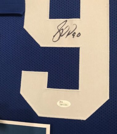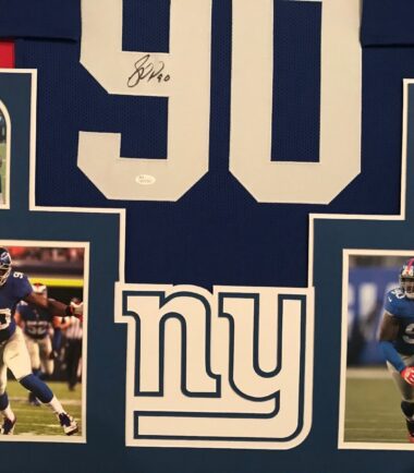 Custom Framed Jason Pierre-Paul hand signed New York Giants custom jersey. JSA Hologram and COA(#WP712381) The authentication is from JSA. This signature is authenticated by a representative of JSA! 100% AUTHENTIC!!! The jersey has fully stitched numbers on the front and back. It is a great item and a must for all great sports fans! This item is professionally framed, it measures 32”x40” inside , 42”x34” outside , using UV protective Acrylic glass for safe keeping and safe transport, team color matting, black moulding and hanging hooks on the back. All additional items in frame seen in pictures included. 100% ready to hang in your fan cave. Returns accepted if item is not as described or damaged and must be returned within 7 days of delivery to buyer.