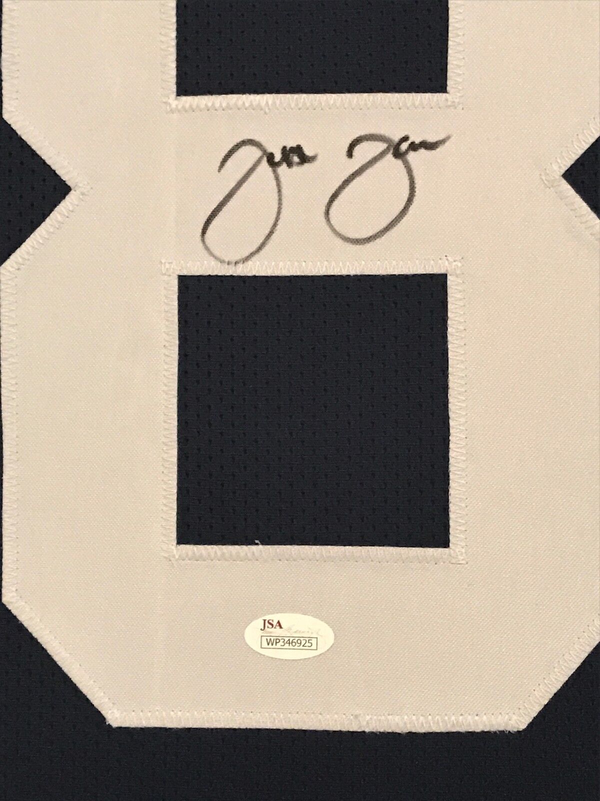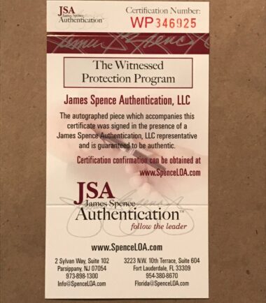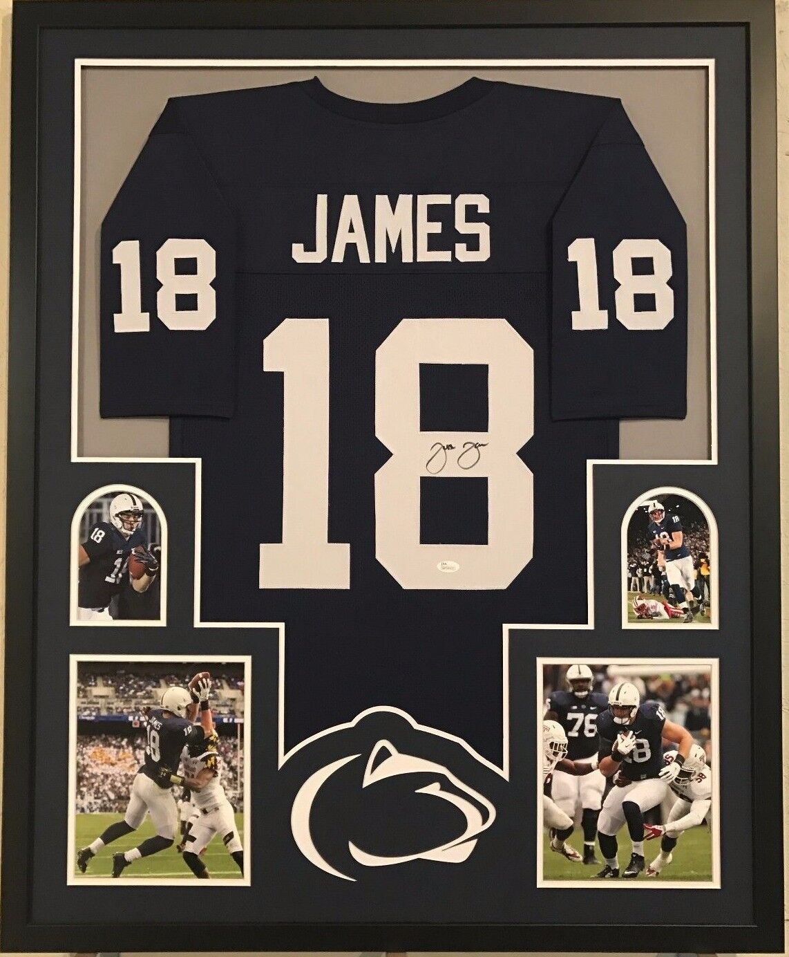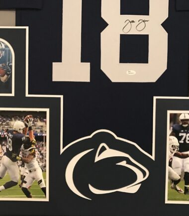 Framed Jesse James hand signed Penn State custom jersey. JSA Hologram and COA(WP346925) The authentication is from JSA. This signature is not authenticated by opinion but it is WITNESSED by a representative of JSA! 100% AUTHENTIC!!! The jersey has fully stitched numbers on the front and back. No tags or logos. This is not an official NCAA jersey but it is very high quality. It is a great item and a must for all great sports fans! This item is professionally framed, it measures 32”x40” inside , 42”x34” outside , using UV protective Acrylic glass for safe keeping and safe transport, team color matting, black moulding and hanging hooks on the back. All additional items in frame seen in pictures included. 100% ready to hang in your fan cave. Returns accepted if item is not as described or damaged and must be returned within 7 days of delivery to buyer.