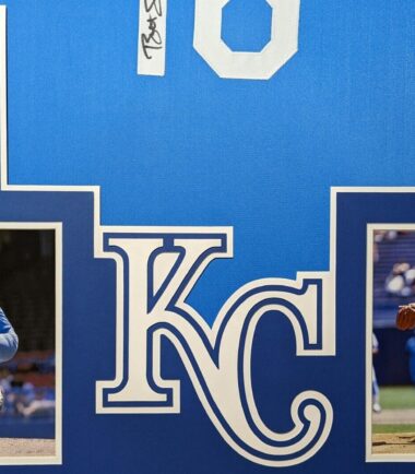 Custom Framed Bret Saberhagen hand signed Kansas City Royals style custom jersey.JSA Hologram and COA – Stock image usedThe authentication is from JSA. This signature is authenticated by a representative of JSA! 100% AUTHENTIC!!! The jersey has fully stitched numbers on the front and back. It is a great item and a must for all great sports fans!This item is professionally framed, it measures 32”x40” inside , 42”x34” outside , using UV protective Acrylic glass for safe keeping and safe transport, team color matting, black moulding and hanging hooks on the back. All additional items in frame seen in pictures included. 100% ready to hang in your fan cave.