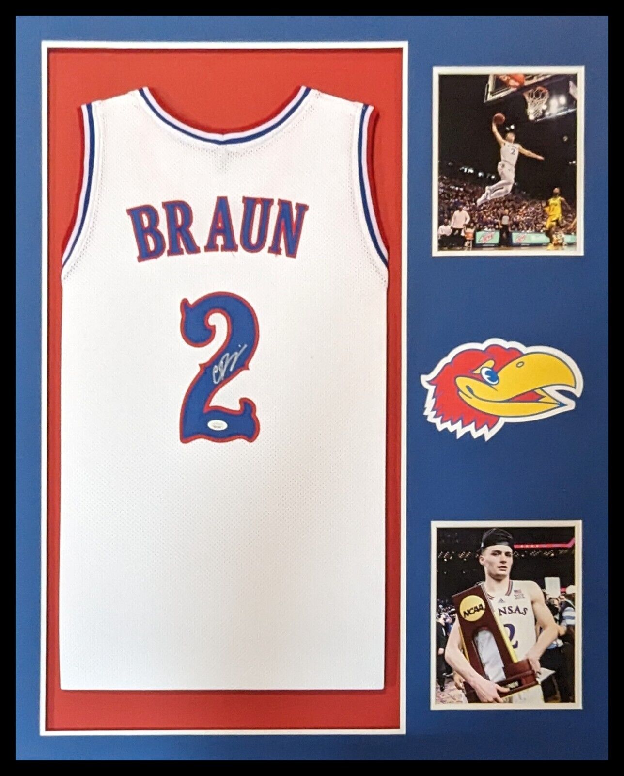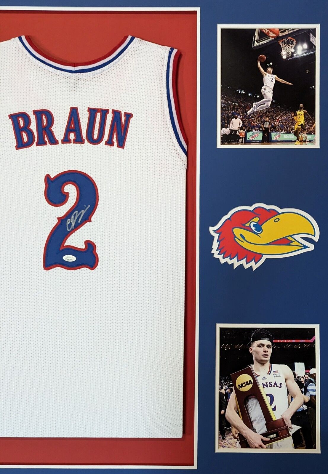 Custom Framed Christian Braun hand signed Kansas Jayhawks style custom jersey JSA Hologram and COA The authentication is from JSA. This signature is not authenticated by opinion but it is WITNESSED by a representative of JSA! 100% AUTHENTIC!!! The jersey has fully stitched numbers on the front and back. It is a great item and a must for all great sports fans! This item is professionally framed, it measures 32”x40” inside , 42”x34” outside , using UV protective Acrylic glass for safe keeping and safe transport, team color matting, black moulding and hanging hooks on the back. All additional items in frame seen in pictures included. 100% ready to hang in your fan cave. Returns accepted if item is not as described or damaged and must be returned within 7 days of delivery to buyer.