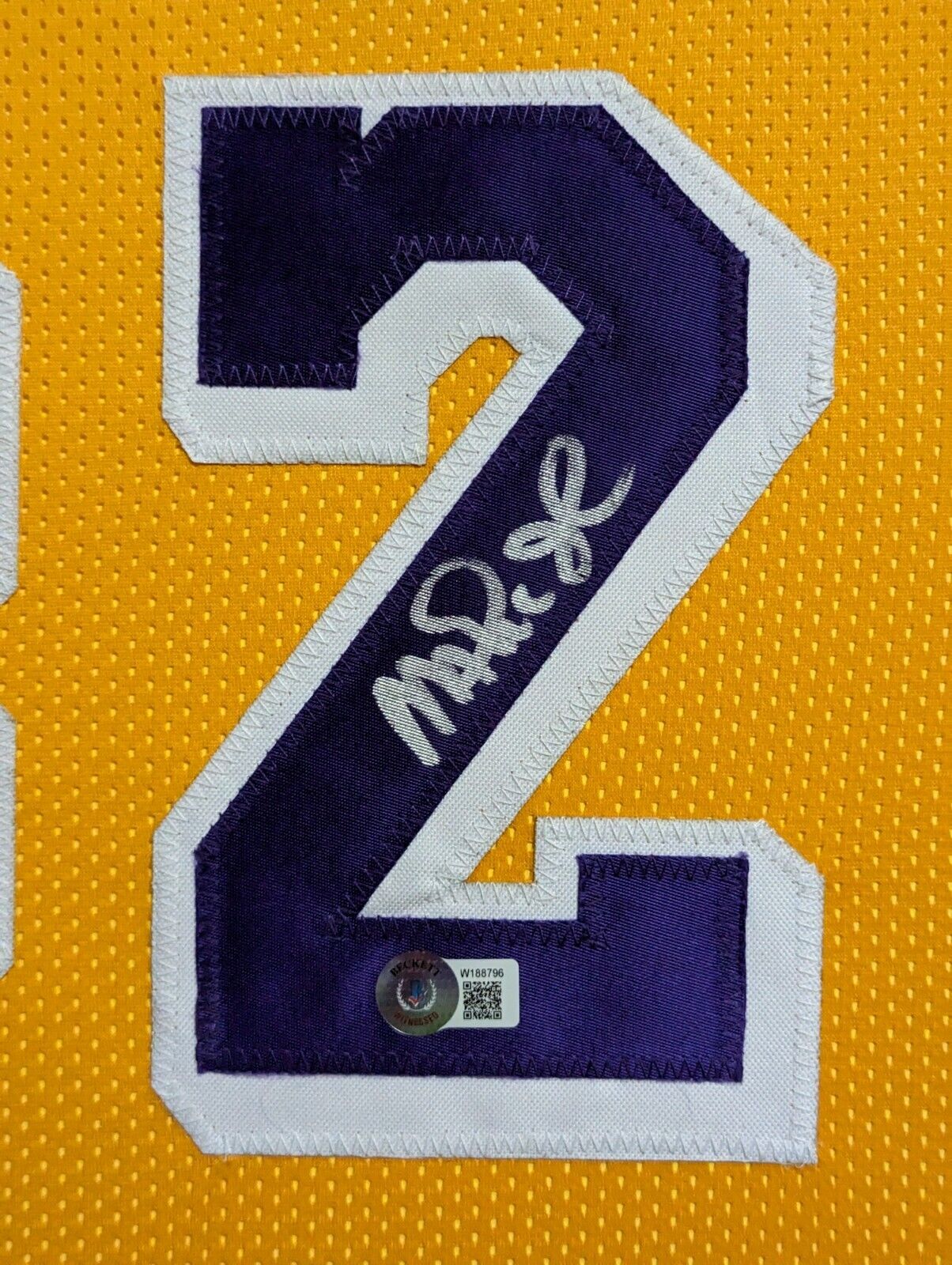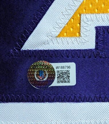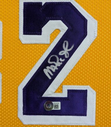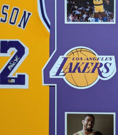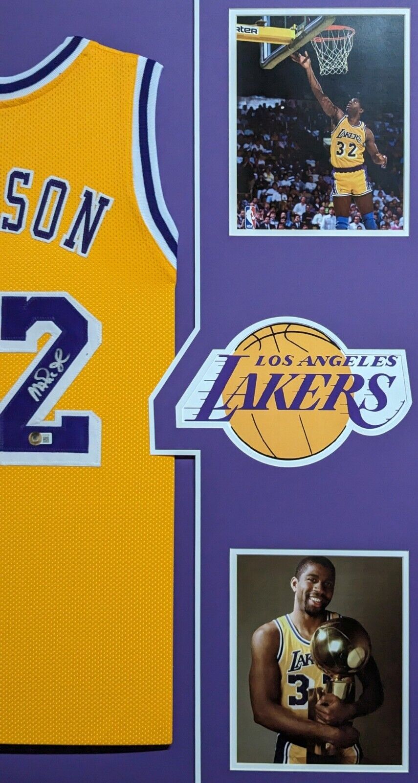 Custom Framed Magic Johnson hand signed L.A. Lakers style custom jersey.Beckett HologramThe authentication is from Beckett. This signature is WITNESSED by a representative of Beckett! 100% AUTHENTIC!!! The jersey has fully stitched numbers on the front and back. It is a great item and a must for all great sports fans!This item is professionally framed, it measures 32”x40” inside , 42”x34” outside , using team color matting, UV protective Acrylic glass for safe keeping and safe transport, team color matting, black moulding and hanging hooks on the back. All additional items in frame seen in pictures included. 100% ready to hang in your fan cave.