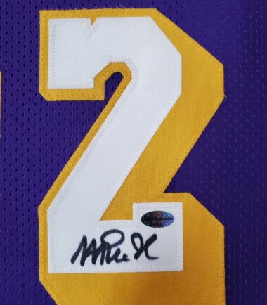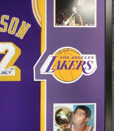 Custom Framed Magic Johnson hand signed L.A. Lakers style custom jersey.LEAF Hologram and COA – (#54375)The authentication is from LEAF. This signature is not authenticated by opinion but it is WITNESSED by a representative of LEAF! 100% AUTHENTIC!!! The jersey has fully stitched numbers on the front and back. It is a great item and a must for all great sports fans!This item is professionally framed, it measures 32”x40” inside , 42”x34” outside , using team color matting, UV protective Acrylic glass for safe keeping and safe transport, team color matting, black moulding and hanging hooks on the back. All additional items in frame seen in pictures included. 100% ready to hang in your fan cave.