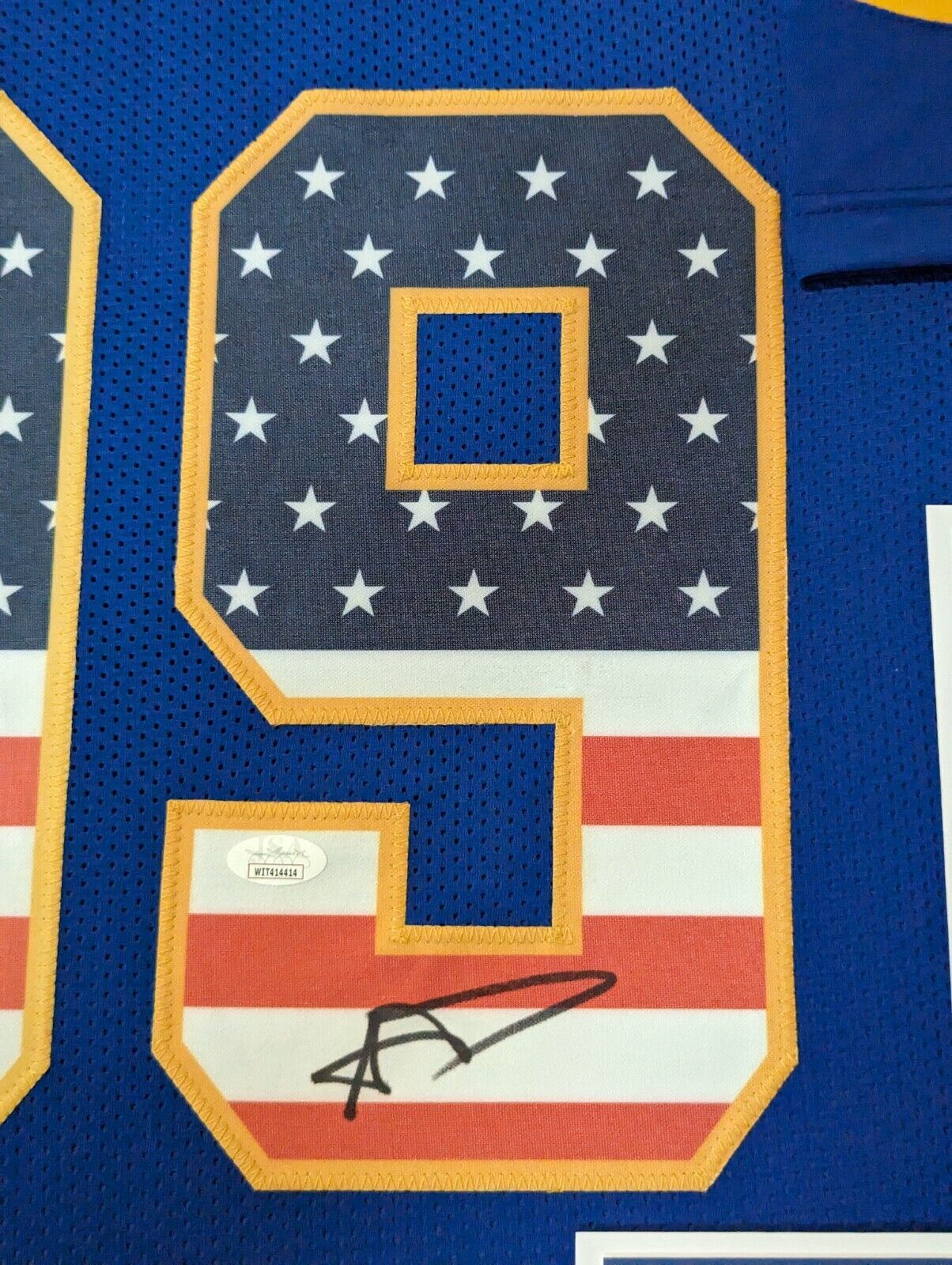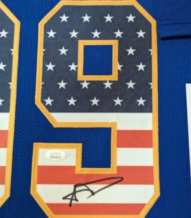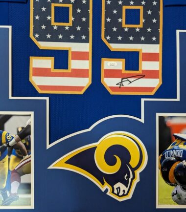 Custom Framed Aaron Donald signed Los Angeles Rams style Custom Jersey JSA Hologram and COA The authentication is from JSA. This signature is authenticated by a representative of JSA! 100% AUTHENTIC!!!   The jersey has fully stitched numbers on the front and back. No tags or logos. This is not an official NFL jersey but it is very high quality. It is a great item and a must for all great sports fans! This item is professionally framed, it measures 32”x40” inside , 42”x34” outside , using UV protective Acrylic glass for safe keeping and safe transport, team color matting, black moulding and hanging hooks on the back.  All additional items in frame seen in pictures included. 100% ready to hang in your fan cave.