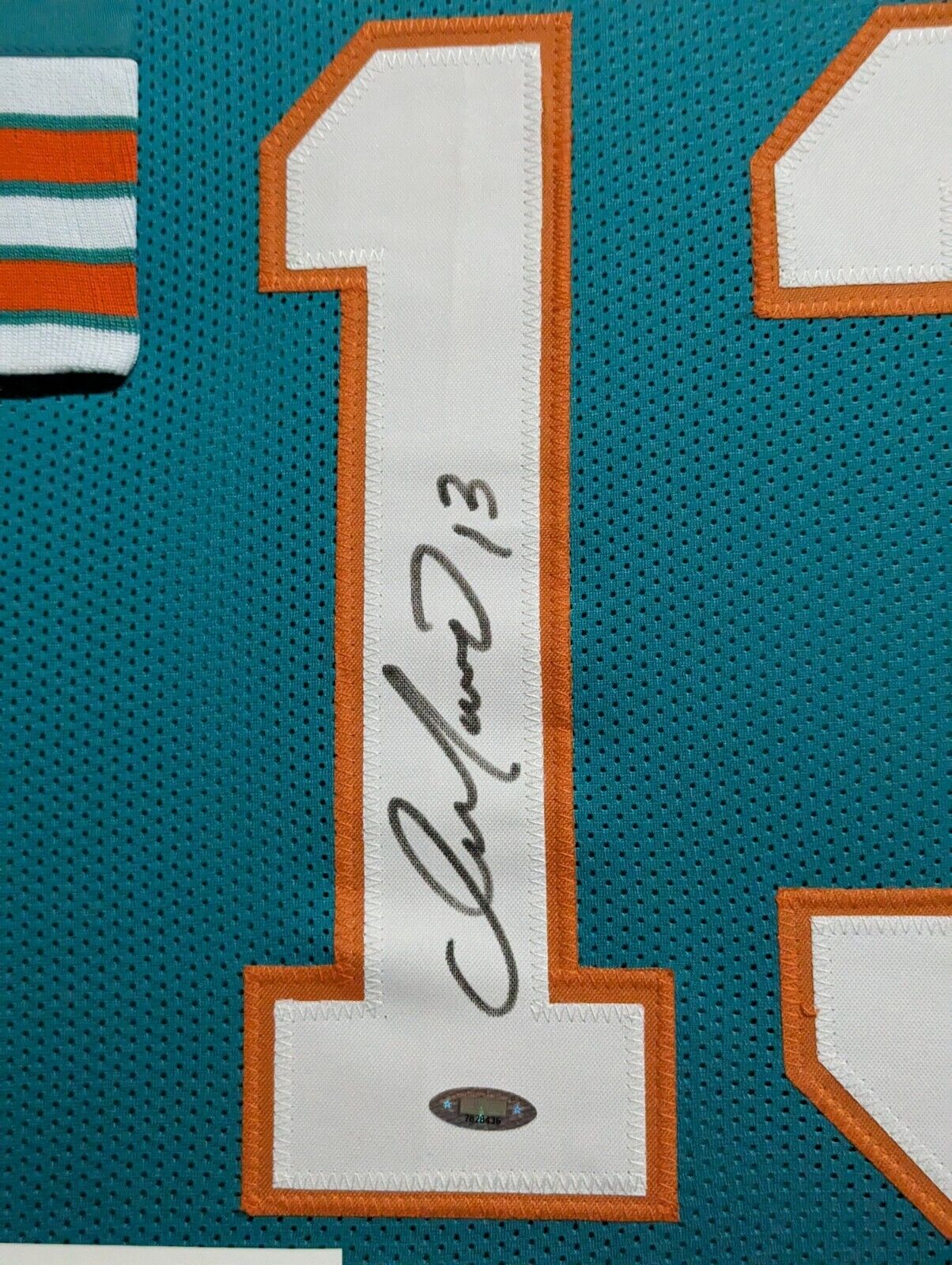 Custom Framed Dan Marino hand signed Miami Dolphins style custom jersey.Tristar HoloThe authentication is from TriStar. This signature is not authenticated by opinion but it is WITNESSED by a representative of TriStar! 100% AUTHENTIC!!! The jersey has fully stitched numbers on the front and back. It is a great item and a must for all great sports fans!This item is professionally framed, it measures 32”x40” inside , 42”x34” outside , using UV protective Acrylic glass for safe keeping and safe transport, team color matting, black moulding and hanging hooks on the back. All additional items in frame seen in pictures included. 100% ready to hang in your fan cave.