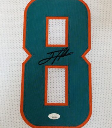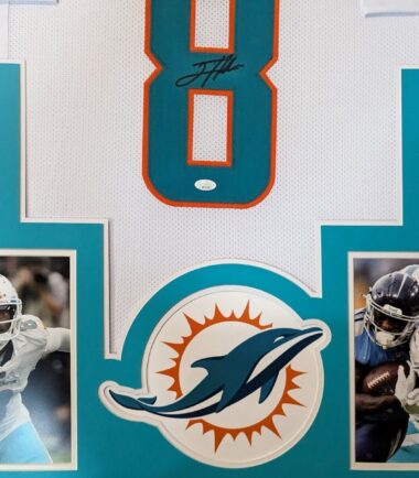 Custom Framed Jevon Holland hand signed Miami Dolphins style custom jersey.JSA Hologram and COAThe authentication is from JSA. This signature is WITNESSED by a representative of JSA! 100% AUTHENTIC!!!   The jersey has fully stitched numbers on the front and back.  It is a great item and a must for all great sports fans!Stock photos are used for auctions. Will receive equal quality.This item is professionally framed, it measures 32”x40” inside , 42”x34” outside , using UV protective Acrylic glass for safe keeping and safe transport, team color matting, black moulding and hanging hooks on the back.  All additional items in frame seen in pictures included. 100% ready to hang in your fan cave.