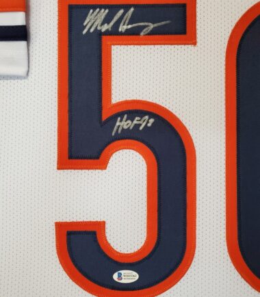 Custom Framed Mike Singletary hand signed inscribed “HOF 98” Chicago Bears style custom jersey.Beckett HologramThe authentication is from BAS. This signature is not authenticated by opinion but it is WITNESSED by a representative of BAS! 100% AUTHENTIC!!! The jersey has fully stitched numbers on the front and back. It is a great item and a must for all great sports fans!Stock photos are used for auctions. Will receive equal quality.This item is professionally framed, it measures 32”x40” inside , 42”x34” outside , using UV protective Acrylic glass for safe keeping and safe transport, team color matting, black moulding and hanging hooks on the back. All additional items in frame seen in pictures included. 100% ready to hang in your fan cave.