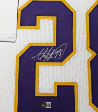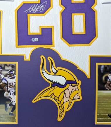 Custom Framed Adrian Peterson hand signed Minnesota Vikings style custom jersey.Beckett HologramThe authentication is from Beckett. This signature is WITNESSED by a representative of Beckett! 100% AUTHENTIC!!! The jersey has fully stitched numbers on the front and back. It is a great item and a must for all great sports fans!Stock photos are used for auctions. Will receive equal quality.This item is professionally framed, it measures 32”x40” inside , 42”x34” outside , using UV protective Acrylic glass for safe keeping and safe transport, team color matting, black moulding and hanging hooks on the back. All additional items in frame seen in pictures included. 100% ready to hang in your fan cave.