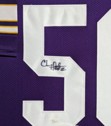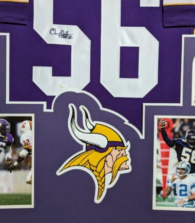 Custom Framed Chris Doleman hand signed Minnesota Vikings style custom jersey.JSA Hologram and COAThe authentication is from JSA. This signature is WITNESSED by a representative of JSA! 100% AUTHENTIC!!! The jersey has fully stitched numbers on the front and back. It is a great item and a must for all great sports fans!Stock photos are used for auctions. Will receive equal quality.This item is professionally framed, it measures 32”x40” inside , 42”x34” outside , using UV protective Acrylic glass for safe keeping and safe transport, team color matting, black moulding and hanging hooks on the back. All additional items in frame seen in pictures included. 100% ready to hang in your fan cave.