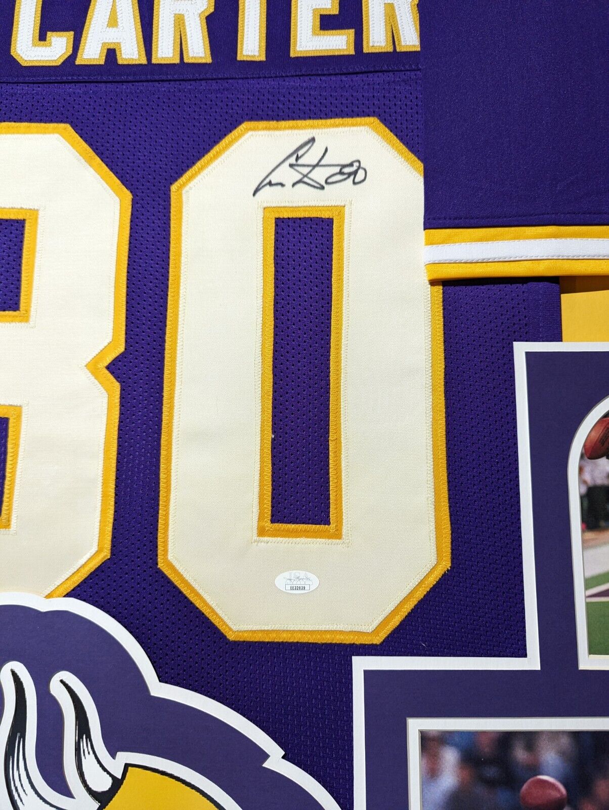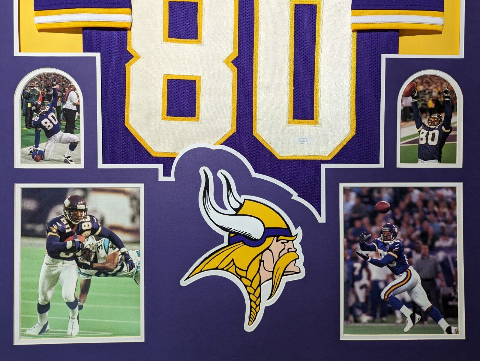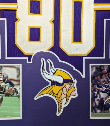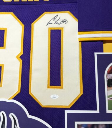 Custom Framed Cris Carter hand signed Minnesota Vikings style custom jersey.JSA COAThe authentication is from JSA. This signature is authenticated by a representative of JSA! 100% AUTHENTIC!!! The jersey has fully stitched numbers on the front and back. It is a great item and a must for all great sports fans!This item is professionally framed, it measures 32”x40” inside , 42”x34” outside , using UV protective Acrylic glass for safe keeping and safe transport, team color SUEDE matting, black moulding and hanging hooks on the back. All additional items in frame seen in pictures included. 100% ready to hang in your fan cave.