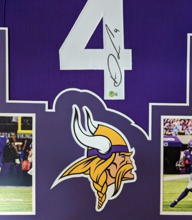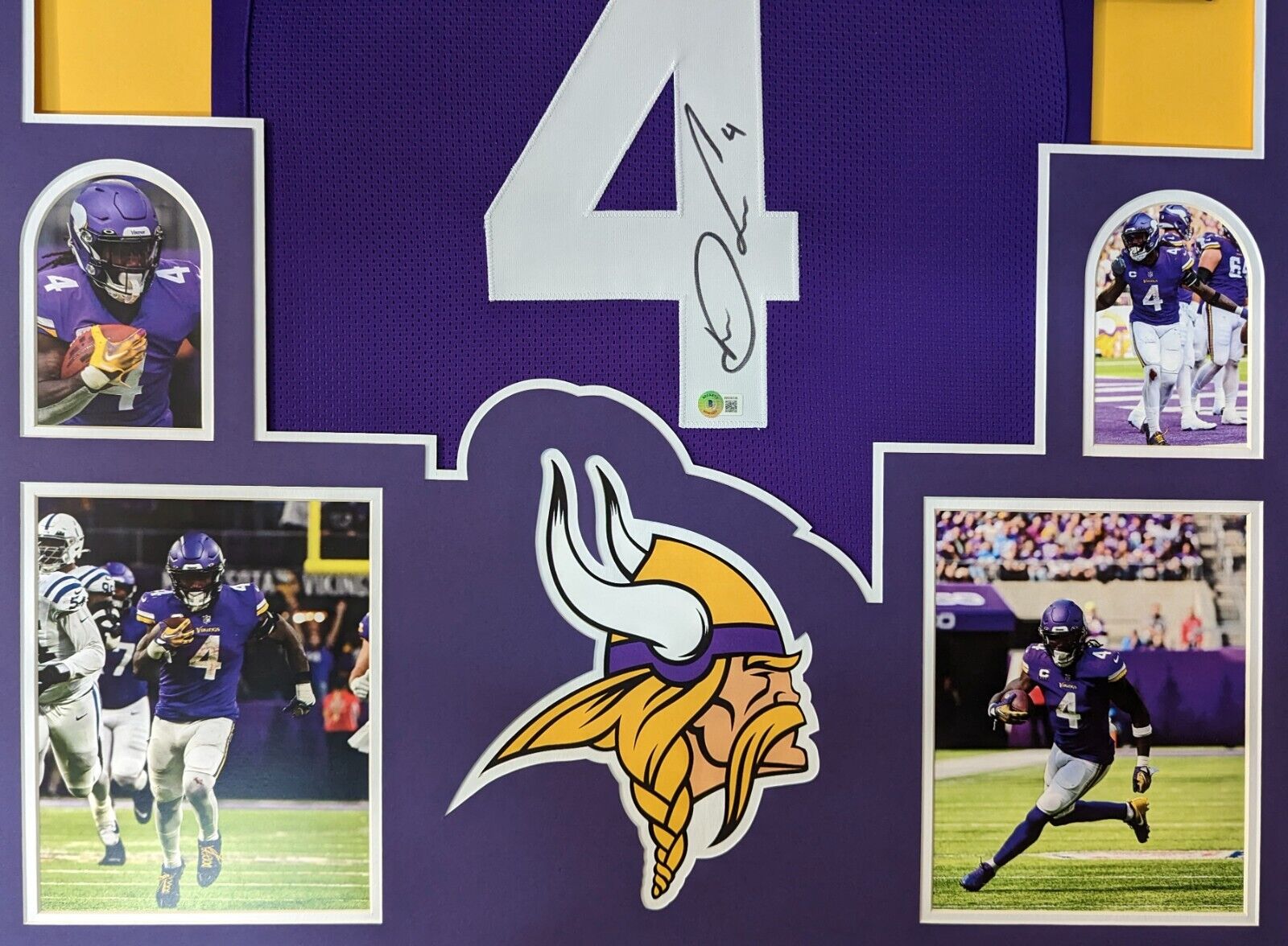 Custom Framed Dalvin Cook hand signed Minnesota Vikings style custom jersey.BECKETT HologramThe authentication is from BAS. This signature is authenticated by a representative of BAS! 100% AUTHENTIC!!! The jersey has fully stitched numbers on the front and back. It is a great item and a must for all great sports fans!This item is professionally framed, it measures 32”x40” inside , 42”x34” outside , using UV protective Acrylic glass for safe keeping and safe transport, team color SUEDE matting, black moulding and hanging hooks on the back. All additional items in frame seen in pictures included. 100% ready to hang in your fan cave.