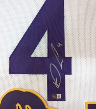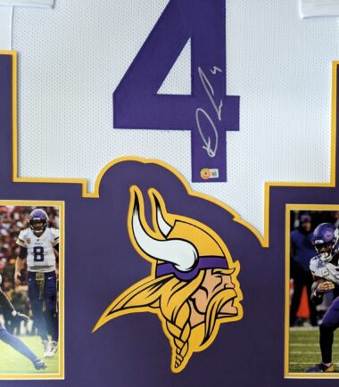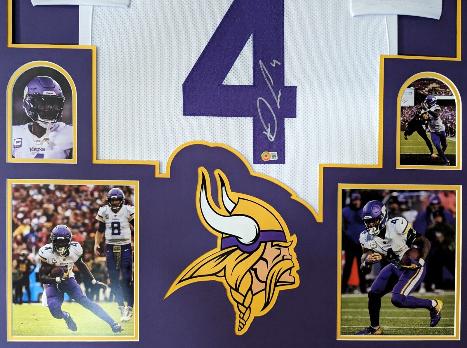Custom Framed Dalvin Cook hand signed Minnesota Vikings style custom jersey.BECKETT HologramThe authentication is from BAS. This signature is authenticated by a representative of BAS! 100% AUTHENTIC!!! The jersey has fully stitched numbers on the front and back. It is a great item and a must for all great sports fans!This item is professionally framed, it measures 32”x40” inside , 42”x34” outside , using UV protective Acrylic glass for safe keeping and safe transport, team color SUEDE matting, black moulding and hanging hooks on the back. All additional items in frame seen in pictures included. 100% ready to hang in your fan cave.