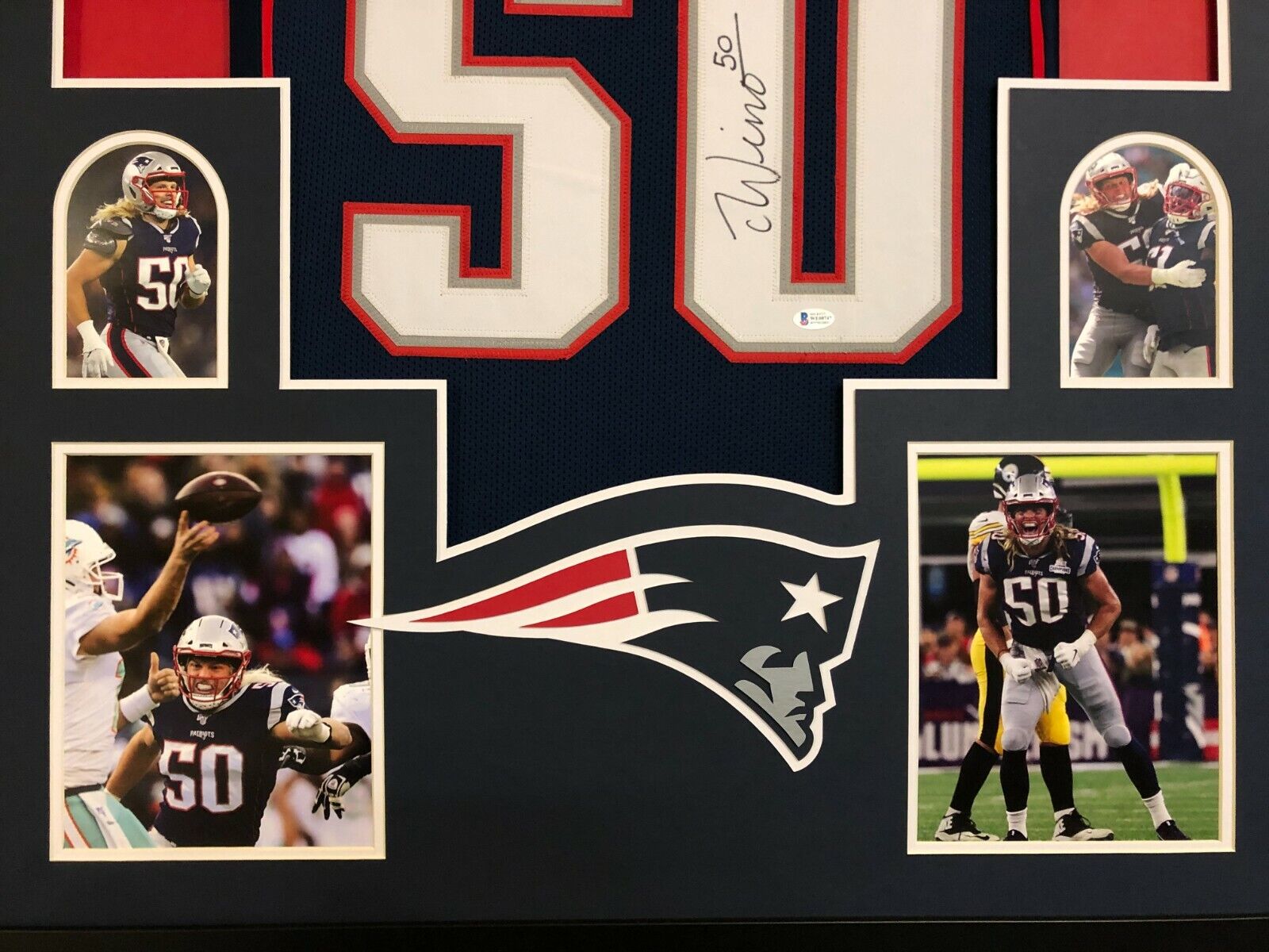 Custom Framed Chase Winovich New England Patriots jersey.BAS Hologram and COA(#WE08747)The authentication is from BAS. This signature is authenticated by a representative of BAS! 100% AUTHENTIC!!!   The jersey has fully stitched numbers on the front and back.  It is a great item and a must for all great sports fans!This item is professionally framed, it measures 32”x40” inside , 42”x34” outside , using UV protective Acrylic glass for safe keeping and safe transport, team color matting, black moulding and hanging hooks on the back.  All additional items in frame seen in pictures included. 100% ready to hang in your fan cave.