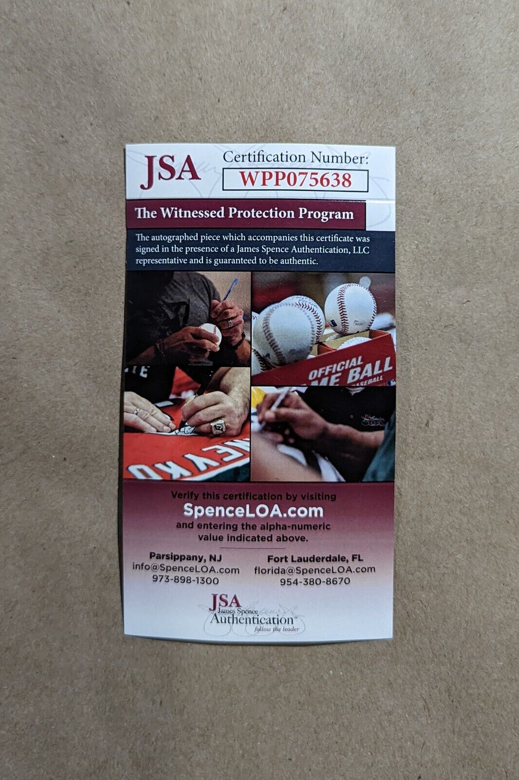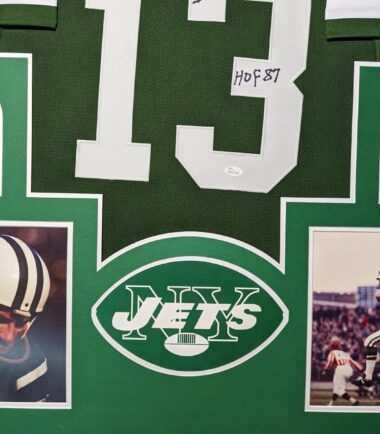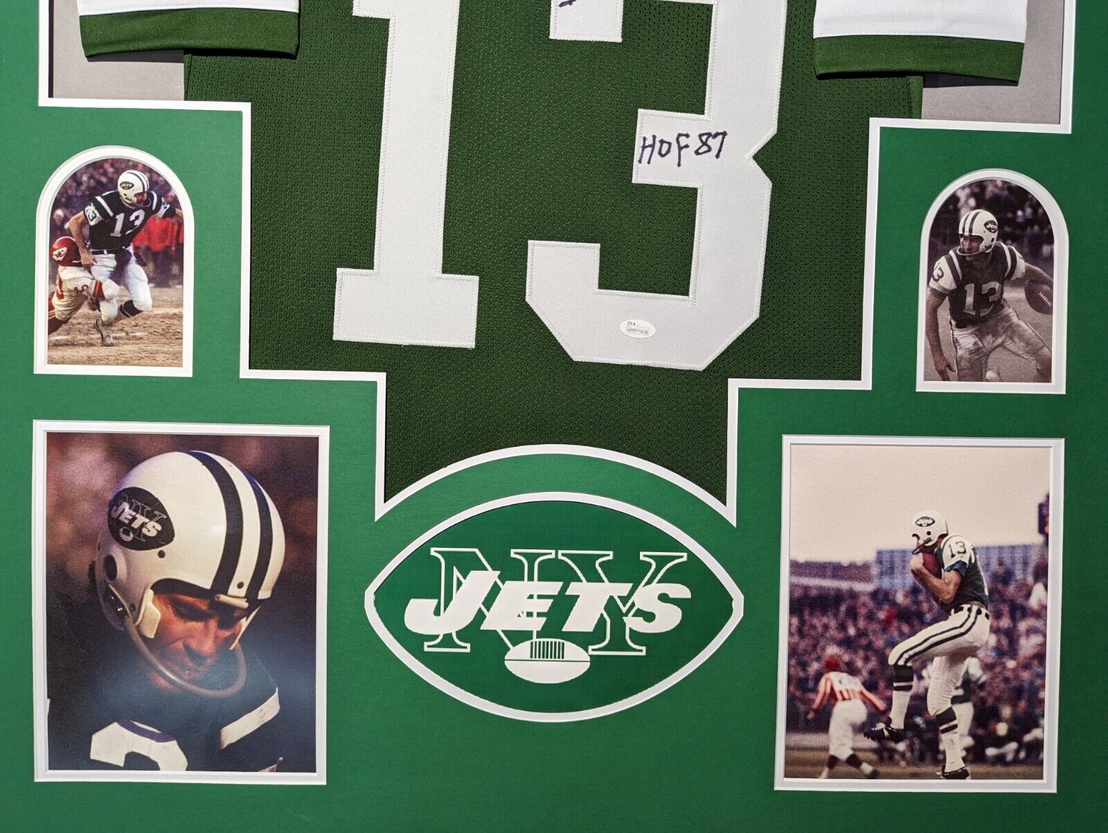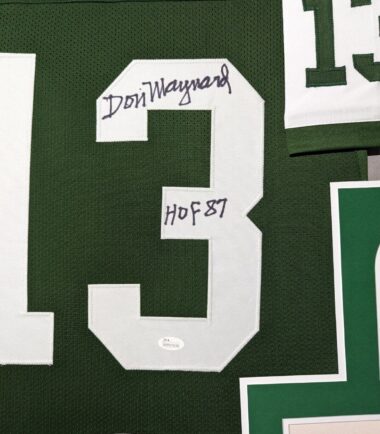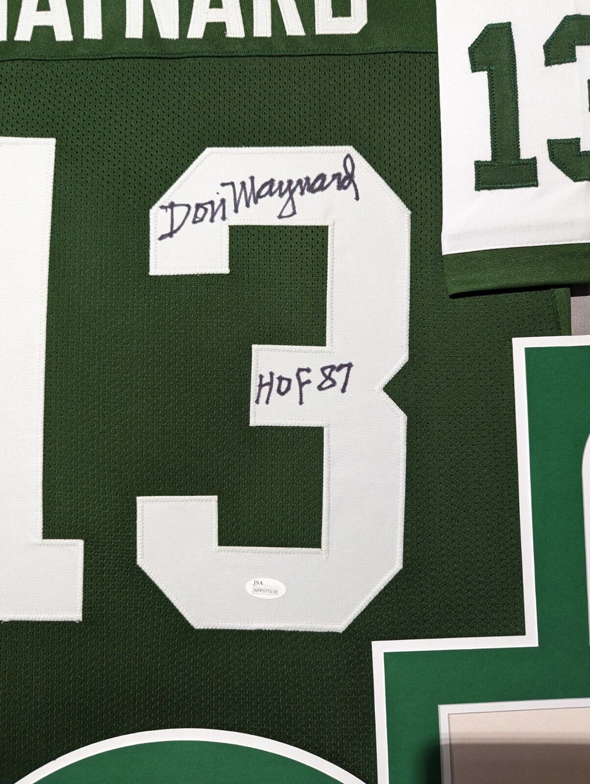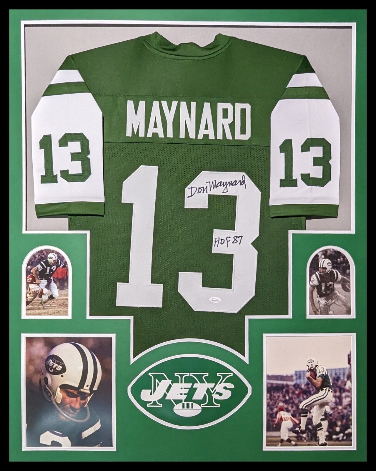 Custom Framed Don Maynard hand signed New York Jets style custom jersey”HOF 87″ InscribedJSA Hologram and COAThe authentication is from JSA. This signature is not authenticated by opinion but it is WITNESSED by a representative of JSA! 100% AUTHENTIC!!! The jersey has fully stitched numbers on the front and back. It is a great item and a must for all great sports fans!Stock photos are used for auctions. Will receive equal quality.This item is professionally framed, it measures 32”x40” inside , 42”x34” outside , using UV protective Acrylic glass for safe keeping and safe transport, team color matting, black moulding and hanging hooks on the back. All additional items in frame seen in pictures included. 100% ready to hang in your fan cave.