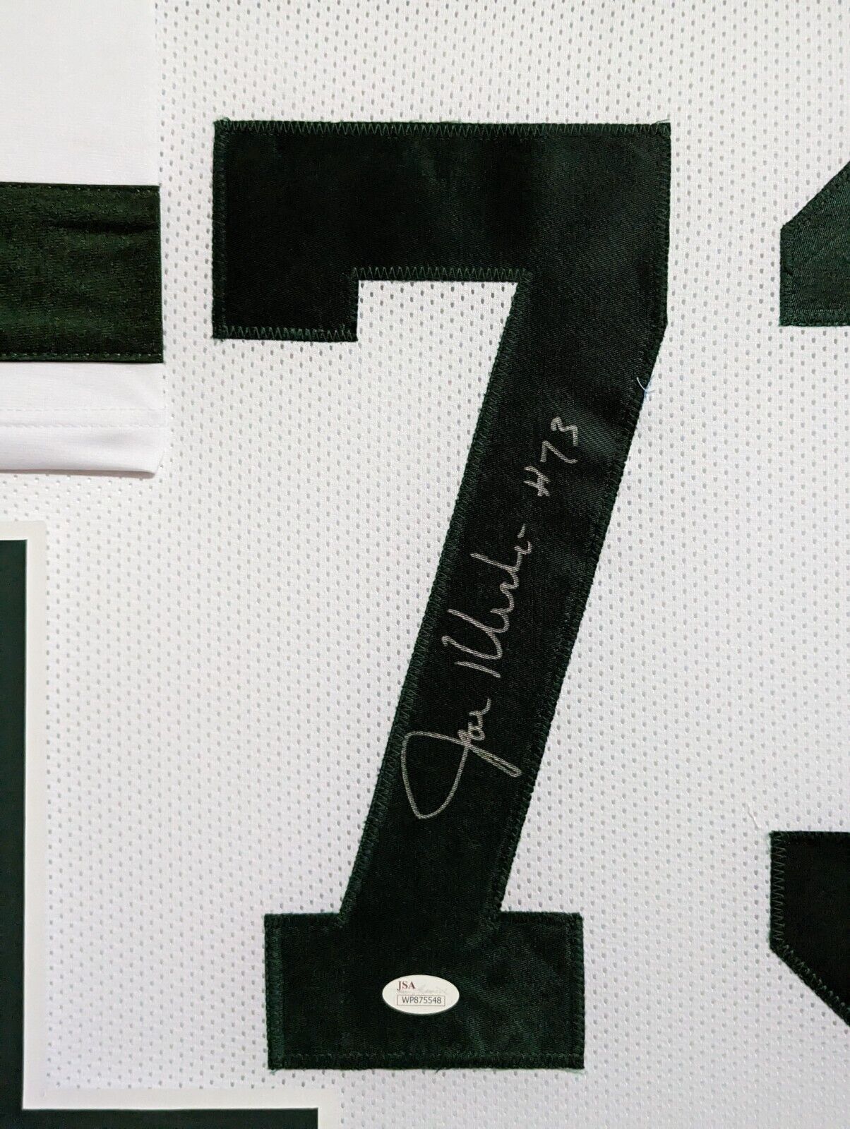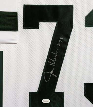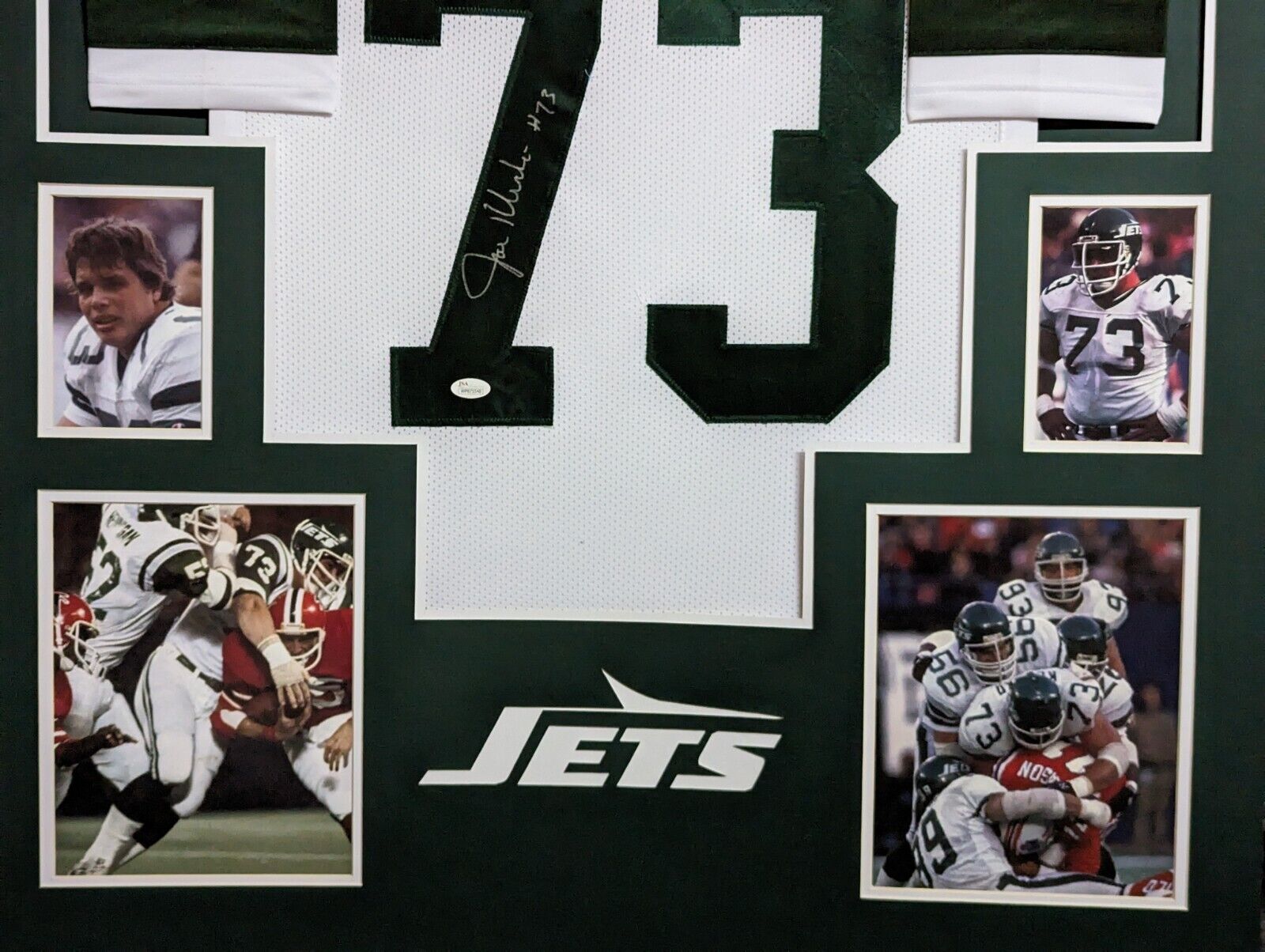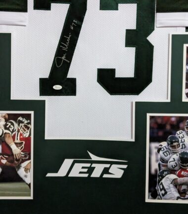 Custom Framed Joe Klecko hand signed New York Jets style custom jerseyJSA Hologram and COAThe authentication is from JSA. This signature is not authenticated by opinion but it is WITNESSED by a representative of JSA! 100% AUTHENTIC!!!   The jersey has fully stitched numbers on the front and back.  It is a great item and a must for all great sports fans!Stock photos are used for auctions. Will receive equal quality.This item is professionally framed, it measures 32”x40” inside , 42”x34” outside , using UV protective Acrylic glass for safe keeping and safe transport, team color matting, black moulding and hanging hooks on the back.  All additional items in frame seen in pictures included. 100% ready to hang in your fan cave.