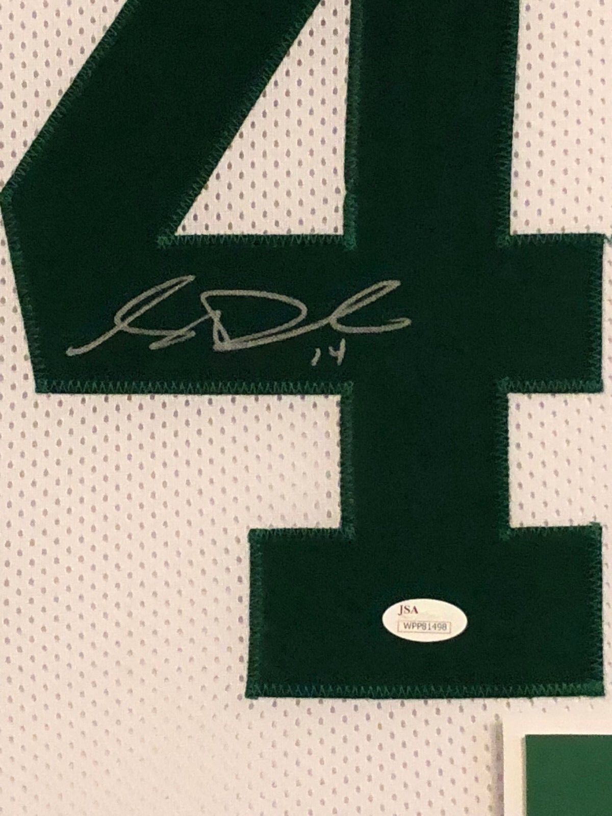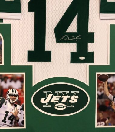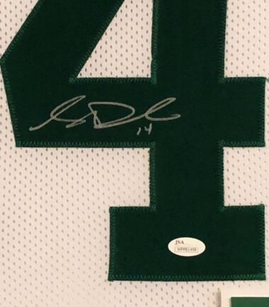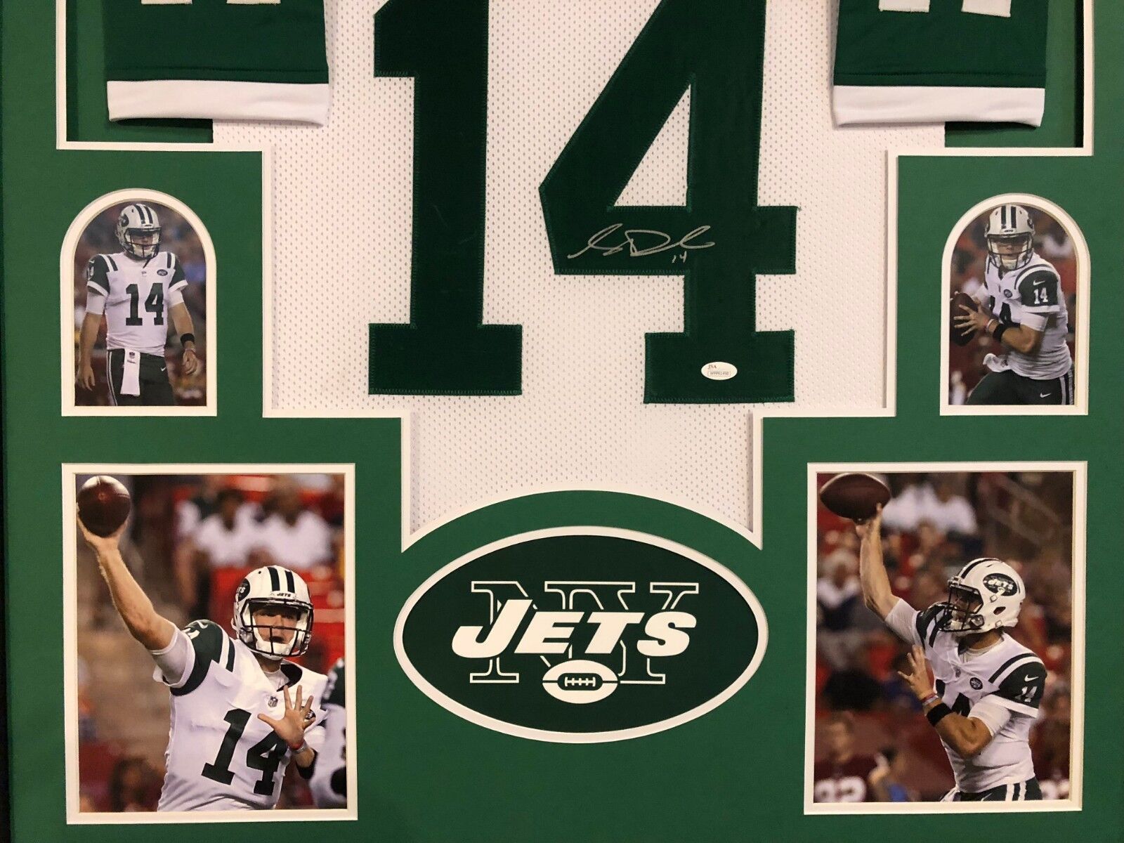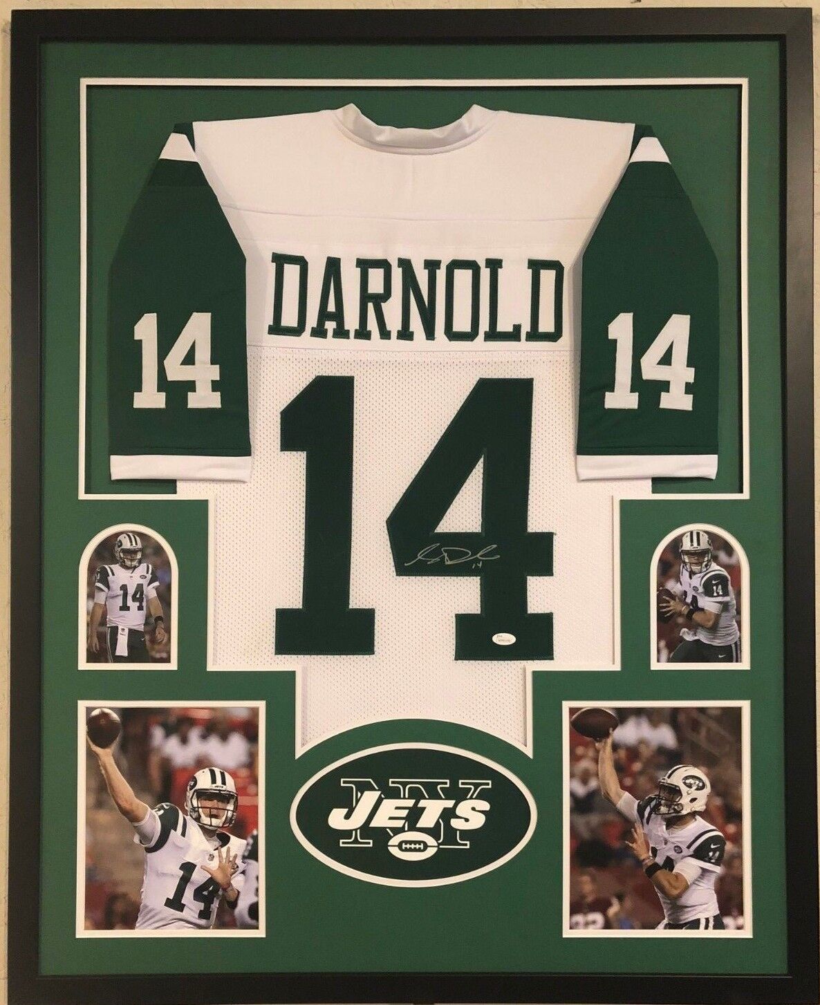 Custom Framed Sam Darnold hand signed New York Jets custom jersey.JSA Hologram and COA(#WPP81498)The authentication is from JSA. This signature is not authenticated by opinion but it is WITNESSED by a representative of JSA! 100% AUTHENTIC!!! The jersey has fully stitched numbers on the front and back. It is a great item and a must for all great sports fans!Stock photos are used for auctions. Will receive equal quality.This item is professionally framed, it measures 32”x40” inside , 42”x34” outside , using UV protective Acrylic glass for safe keeping and safe transport, team color matting, black moulding and hanging hooks on the back. All additional items in frame seen in pictures included. 100% ready to hang in your fan cave.