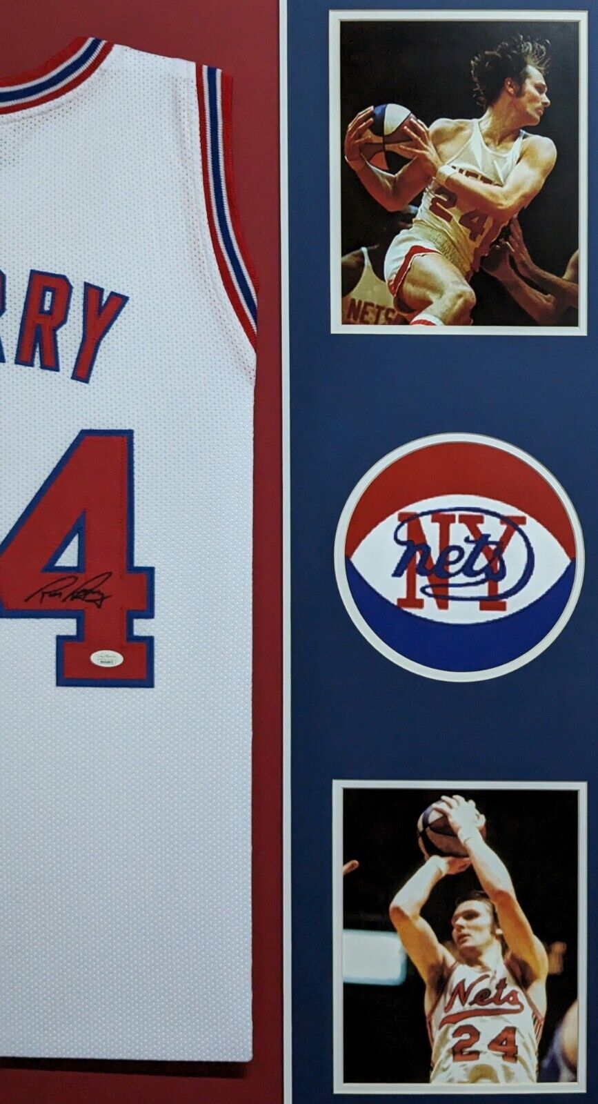Custom Framed Rick Berry hand signed New York Nets style custom jersey JSA Hologram and COA The authentication is from JSA. This signature is WITNESSED by a representative of JSA! 100% AUTHENTIC!!! The jersey has fully stitched numbers on the front and back. It is a great item and a must for all great sports fans! This item is professionally framed, it measures 32”x40” inside , 42”x34” outside , using UV protective Acrylic glass for safe keeping and safe transport, team color matting, black moulding and hanging hooks on the back. All additional items in frame seen in pictures included. 100% ready to hang in your fan cave. Returns accepted if item is not as described or damaged and must be returned within 7 days of delivery to buyer.